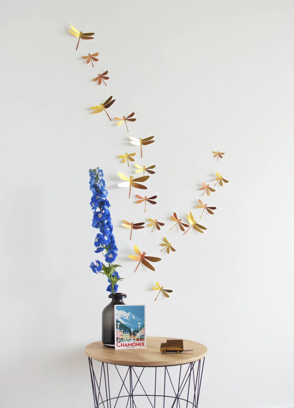 Ein Schwarm aus 29 Papier-Libellen in warmem gelb verwandelt eine kahle Wand in ein dynamisch wirkendes Kunstwerk. Ein Hingucker mit unglaublich lebendiger Ausstrahlung.