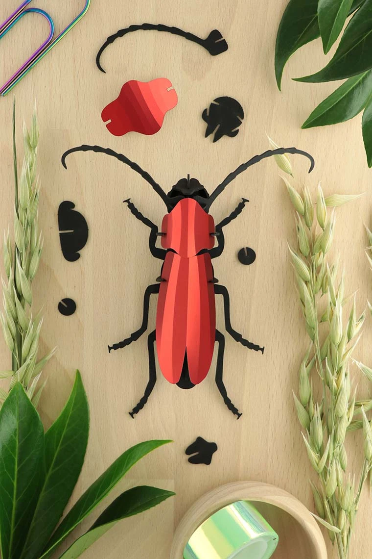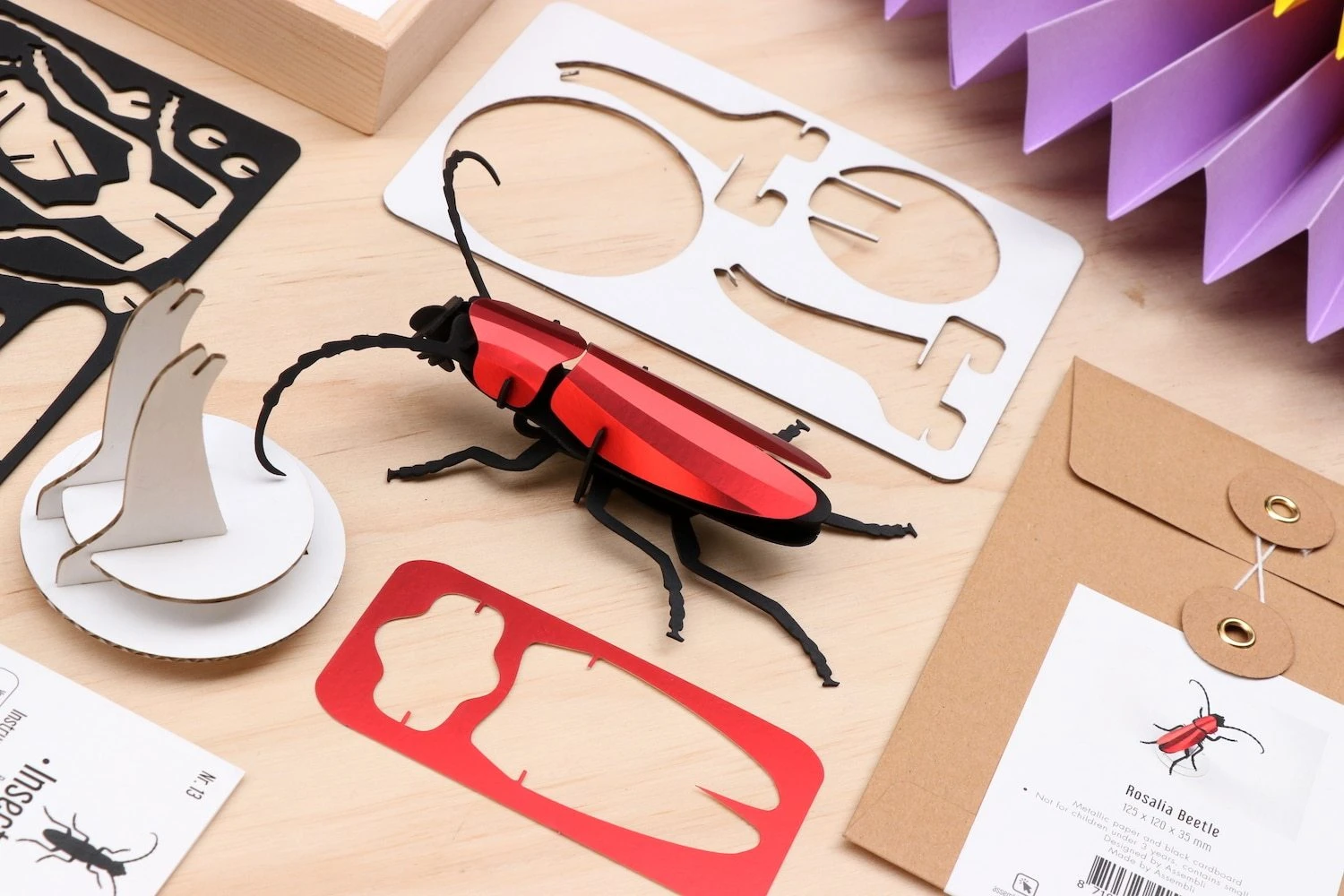 Dieses 3D-Puzzle-Kit enthält alle Teile, um die Rosalia Käfer kleberfrei zusammenzubauen. Der Käferkörper besteht aus schwarzem Karton. Die Schildteile sind aus changierendem Metallpapier.