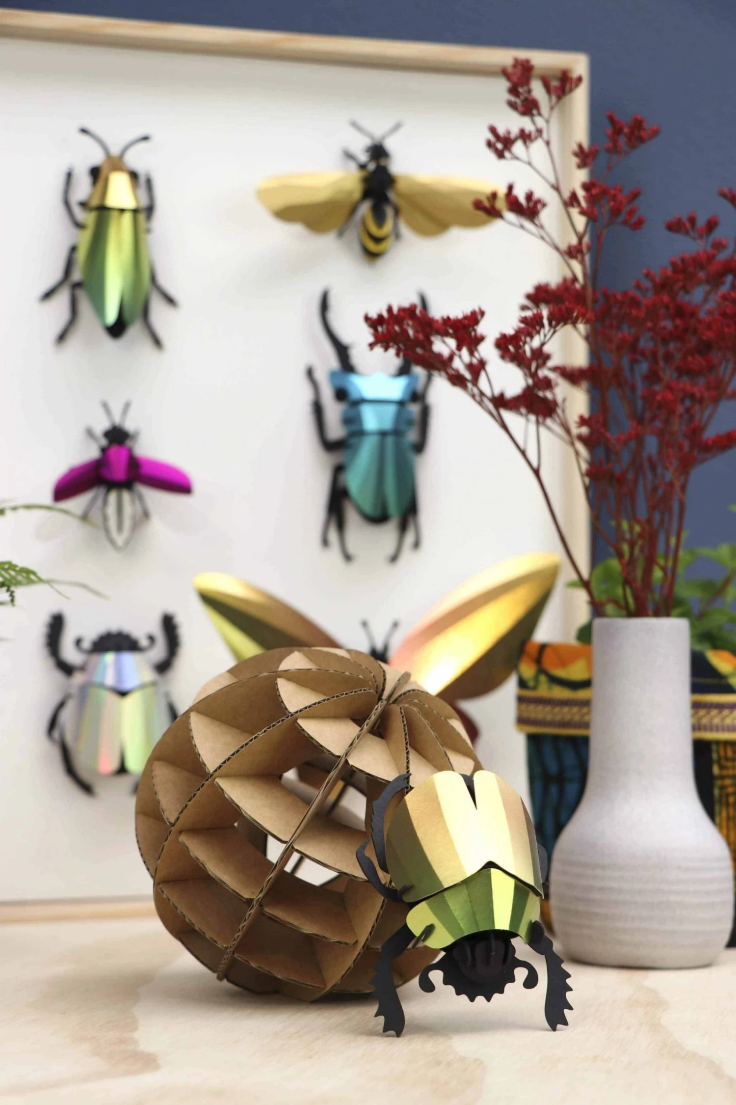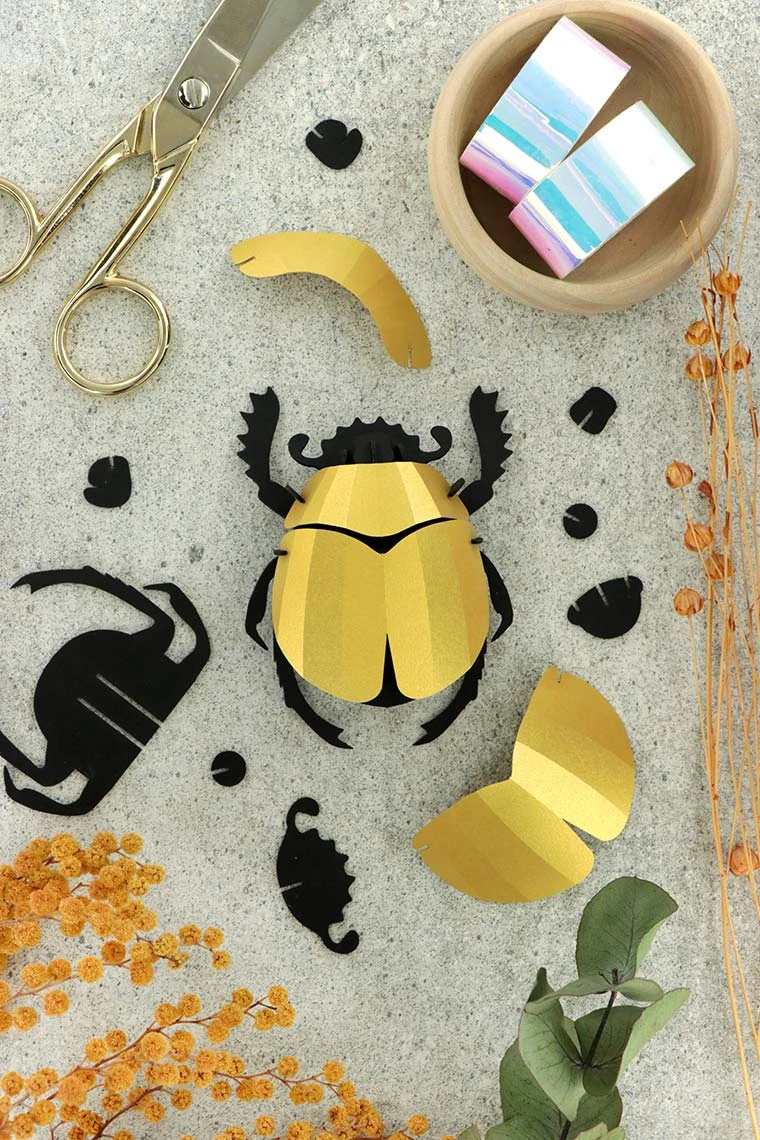 Dieses 3D-Puzzle-Kit enthält alle Teile, um die Skarabäus Käfer kleberfrei zusammenzubauen. Der Käferkörper besteht aus schwarzem Karton. Die Schildteile, aus Metallpapier in schillerndem „mattgold“.