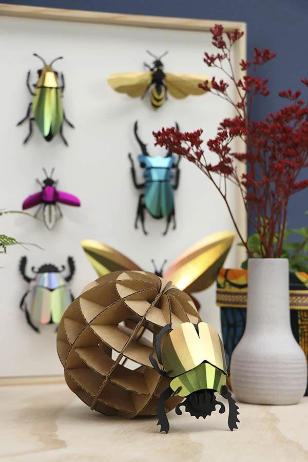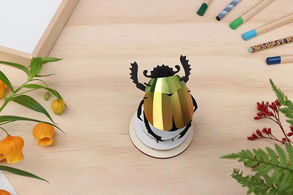 Dieses 3D-Puzzle-Kit enthält alle Teile, um die Skarabäus Käfer kleberfrei zusammenzubauen. Der Käferkörper besteht aus schwarzem Karton. Die Schildteile, aus Metallpapier in schillerndem „Mangogrün“.