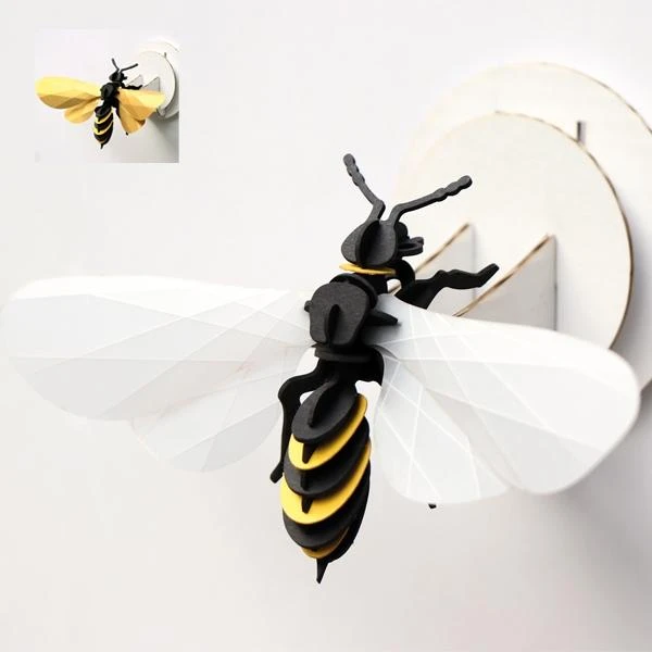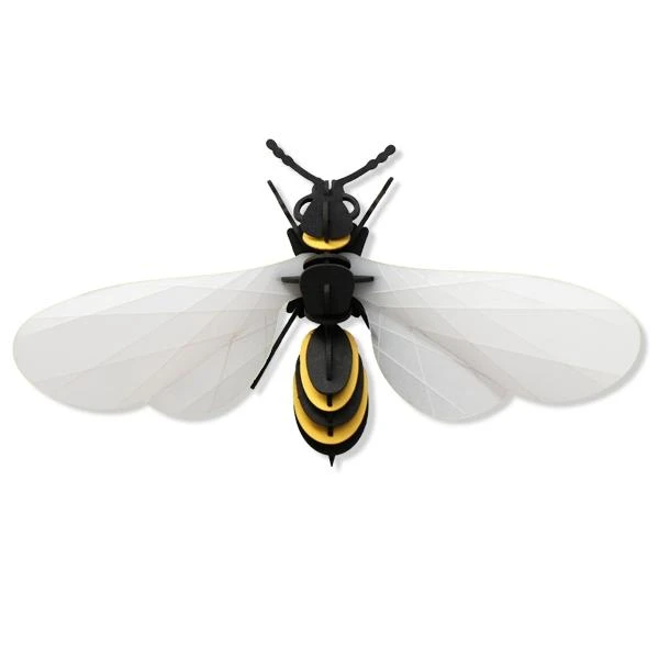Dieses 3D-Puzzle-Kit enthält alle Teile, um die Papierwespe kleberfrei zusammenzubauen. Der Wespenkörper besteht aus schwarzem Karton. Die Flügel sind aus transparentem Papier.