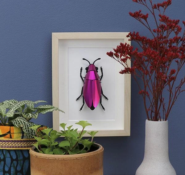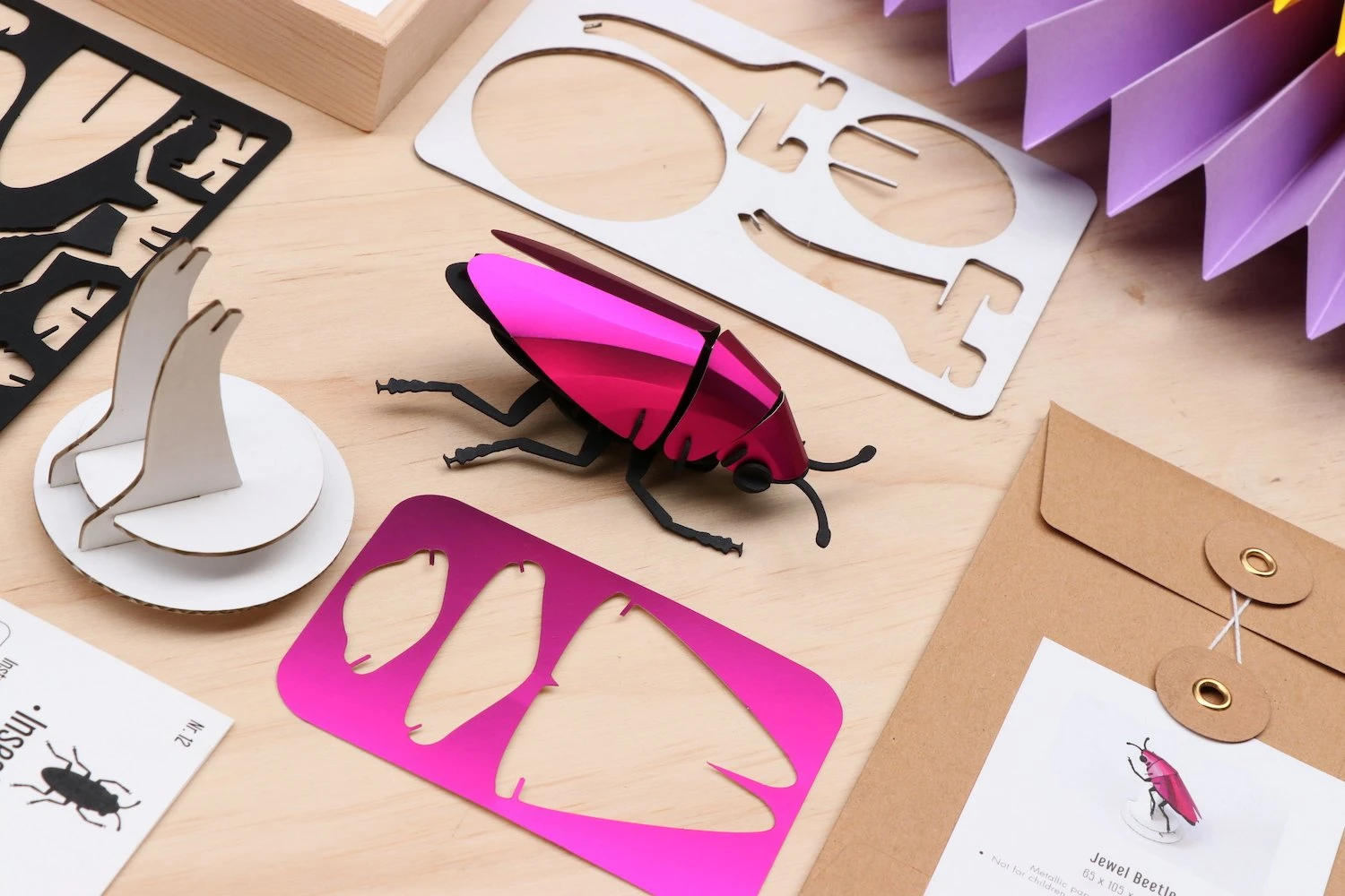 Ein 3D Puzzle der besonderen Art. Nachdem Du die gestanzten Formen aus dem Papier getrennt hast, bastelst Du damit einen pinkfarbenen Schmuckkäfer. Sein Körper ist aus matter schwarzer Pappe. Die Flügel aus schillerndem Papier.