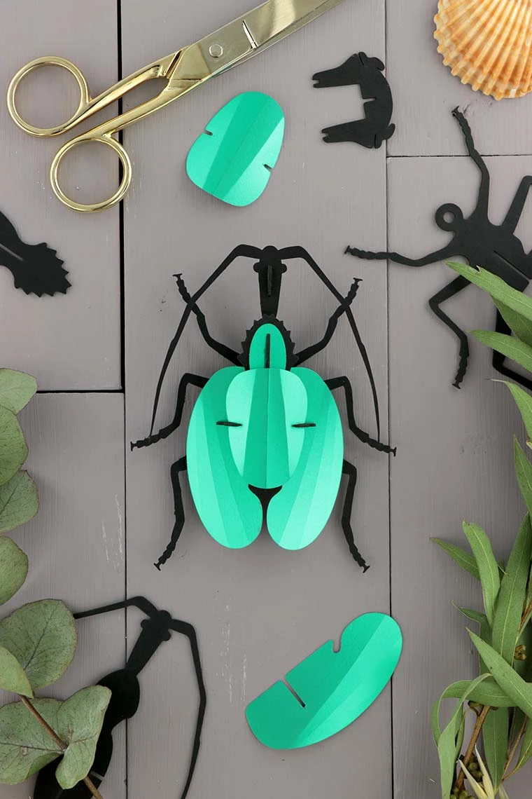 Diesen filigranen Käfer mit seinen dünnen Beinchen kannst Du tatsächlich selbst zusammen stecken! Sein schwarzer Körper kontrastiert mit seinen grünen Flügeln.