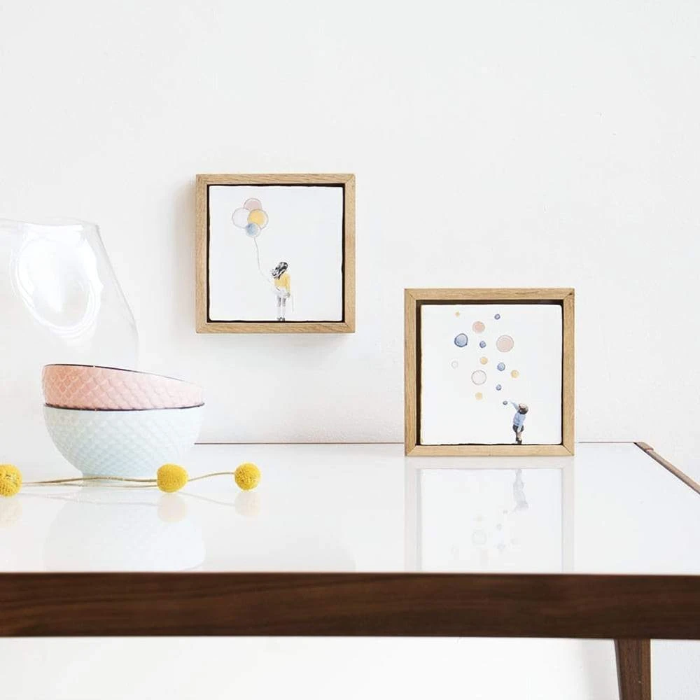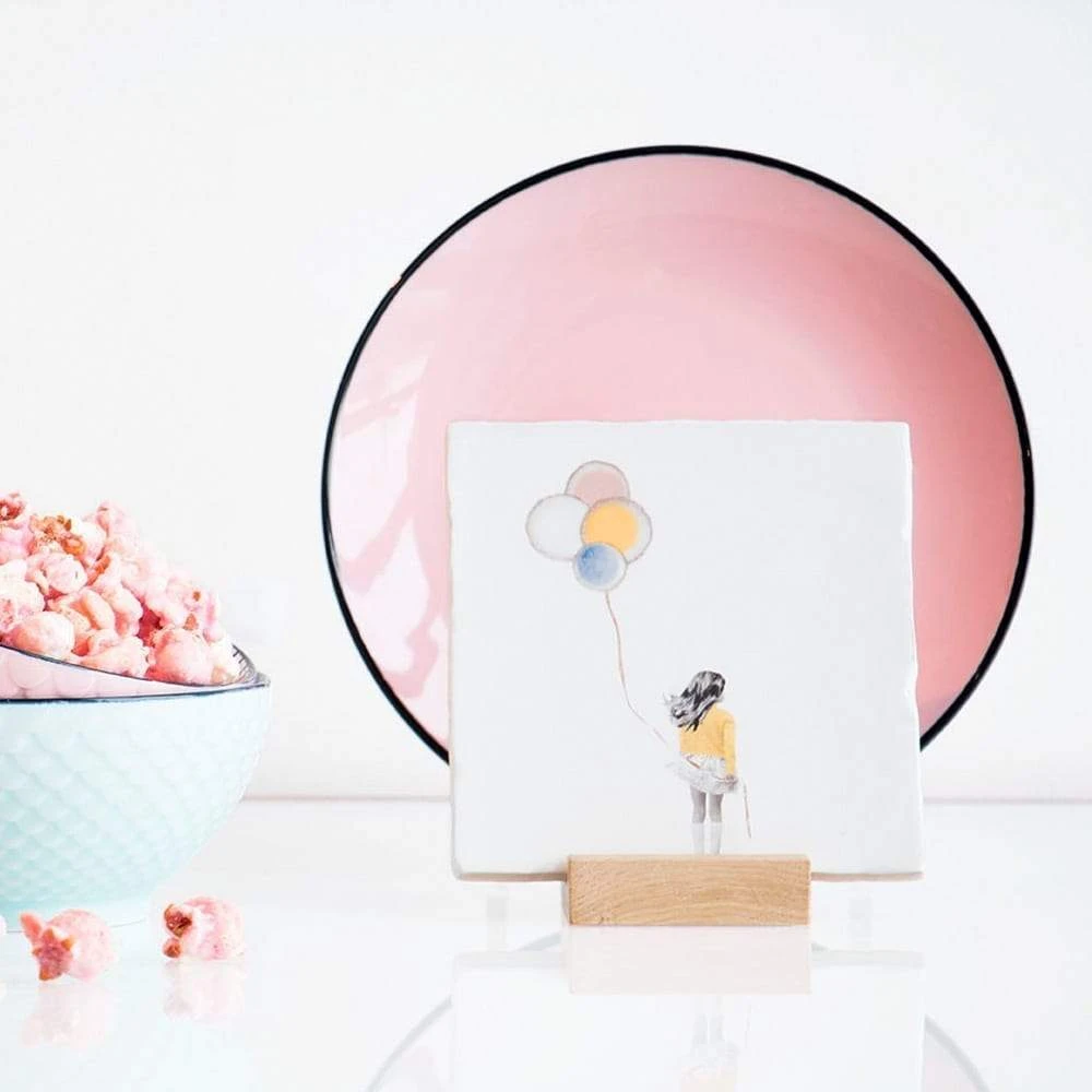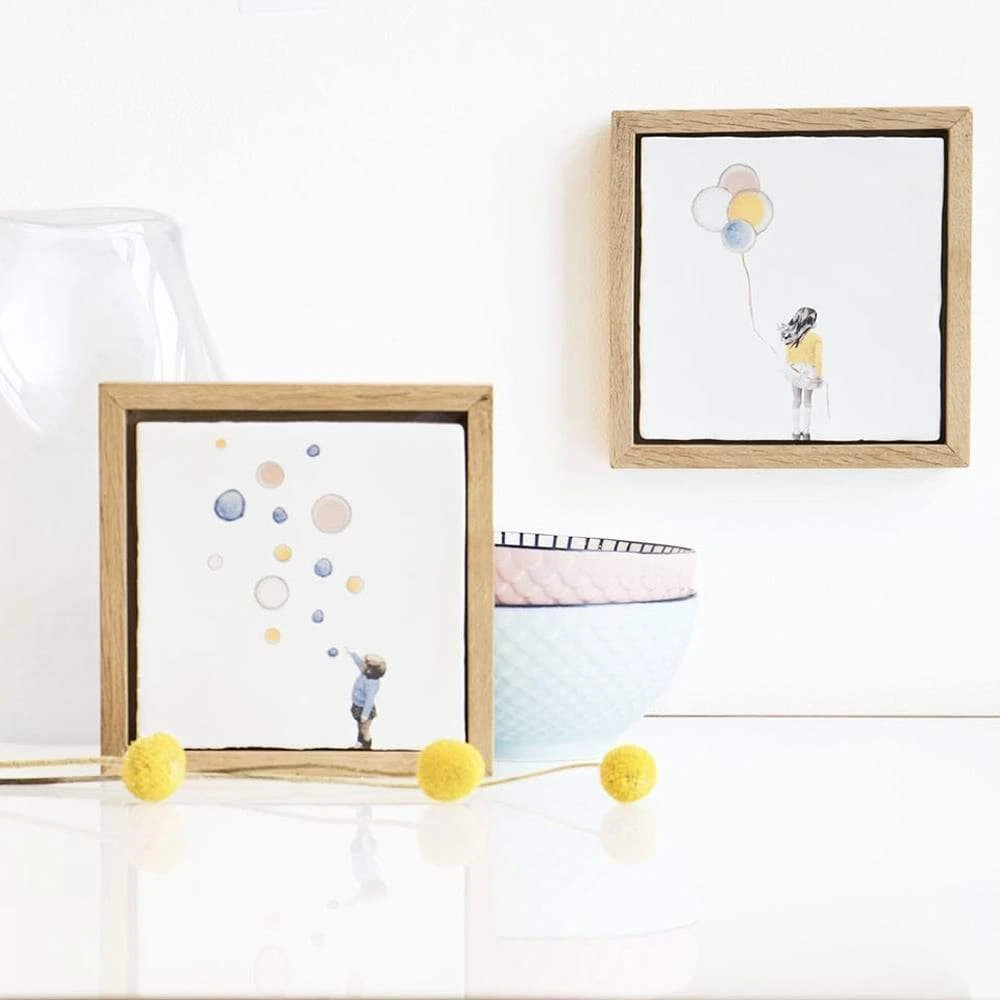 Ballons, die Träume in Erfüllung gehen lassen. Das ist die Geschichte, die auf dieser Fliese erzählt wird. Künstlerin Marga von Oers hat StoryTiles gegründet, das Siebgedruckte Illustrationen auf handgemachte Fliesen bringt.