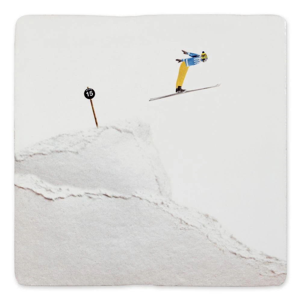 Was für ein mutiger Sprung abseits der Piste! Der Skifahrer oder die Skifahrerin wagen es.