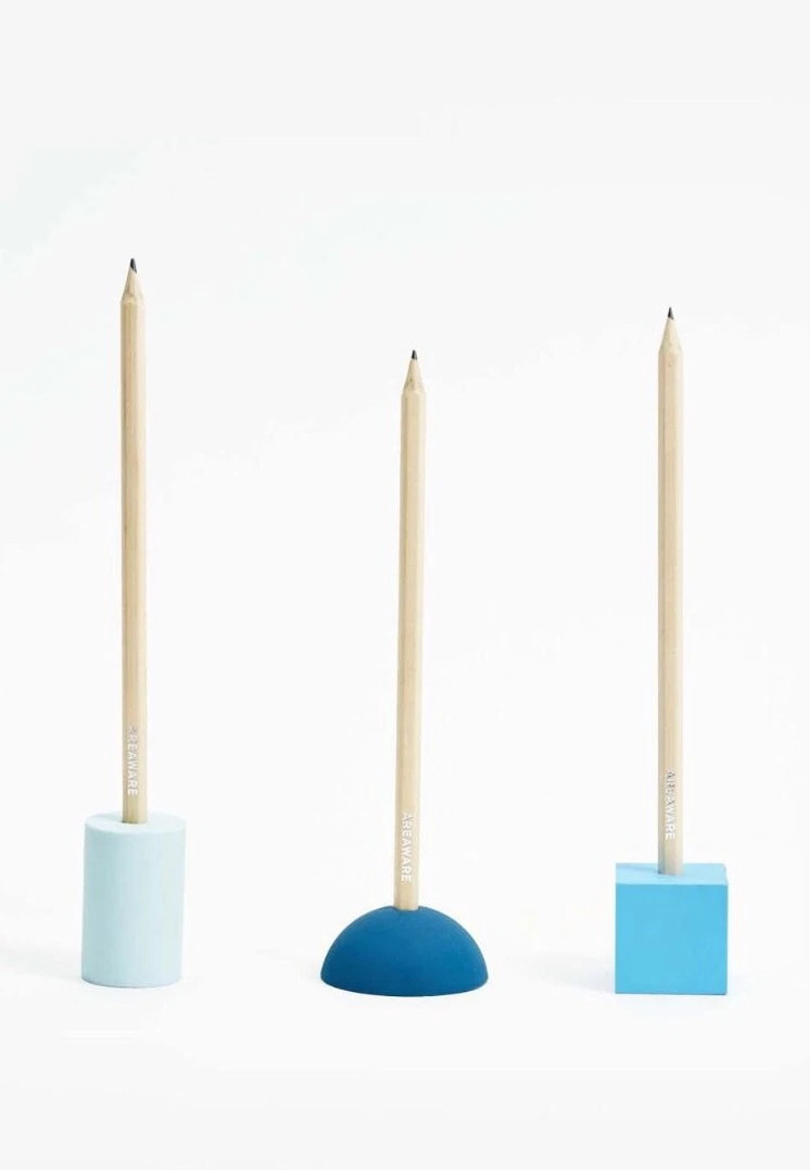 Ziemlich cool sind die Radierer mit Bleistift von Areaware. Sie sorgen nämlich dafür, dass der Bleistift schön im Raum steht und bilden mit ihm gemeinsam eine Skulptur.