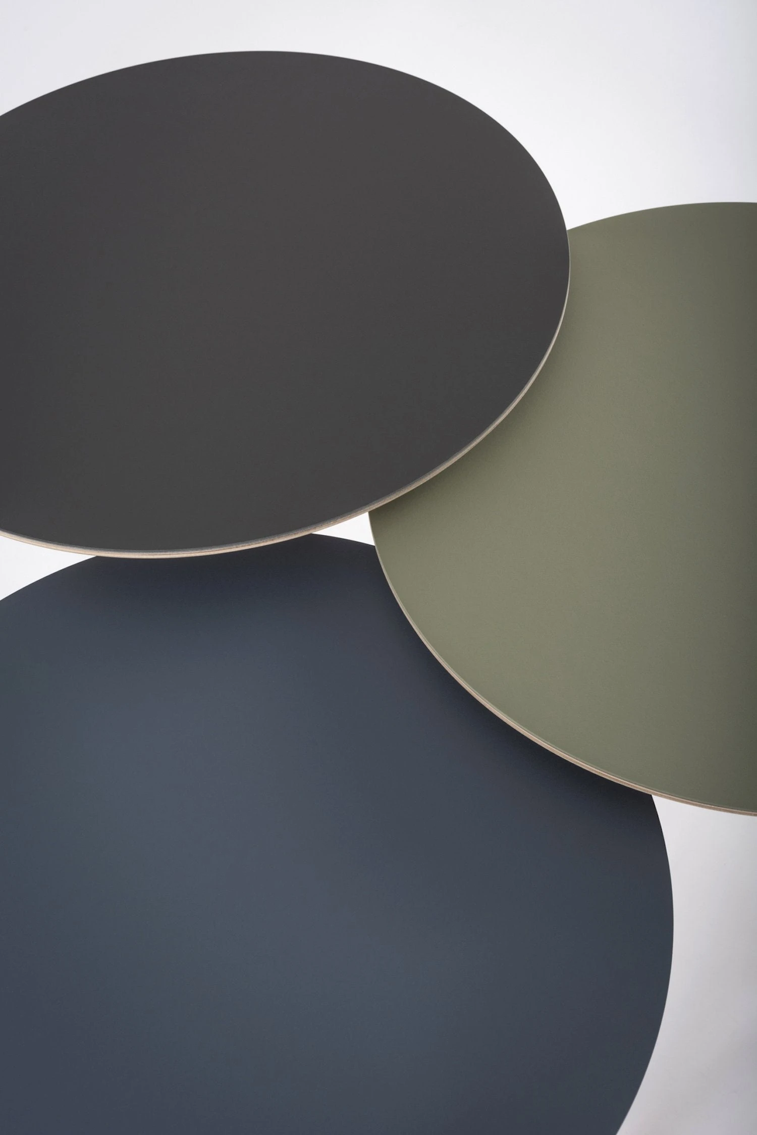 ARP gibt es in zwei Größen und jeweils drei Tischplatten- Farben: schwarz (Nero), grün (Dark olive) und dunkelblau (Smokey blue). Der hier gezeigte Tisch mit 45cm Durchmesser hat die längeren Beine: Er ist 55 cm hoch.