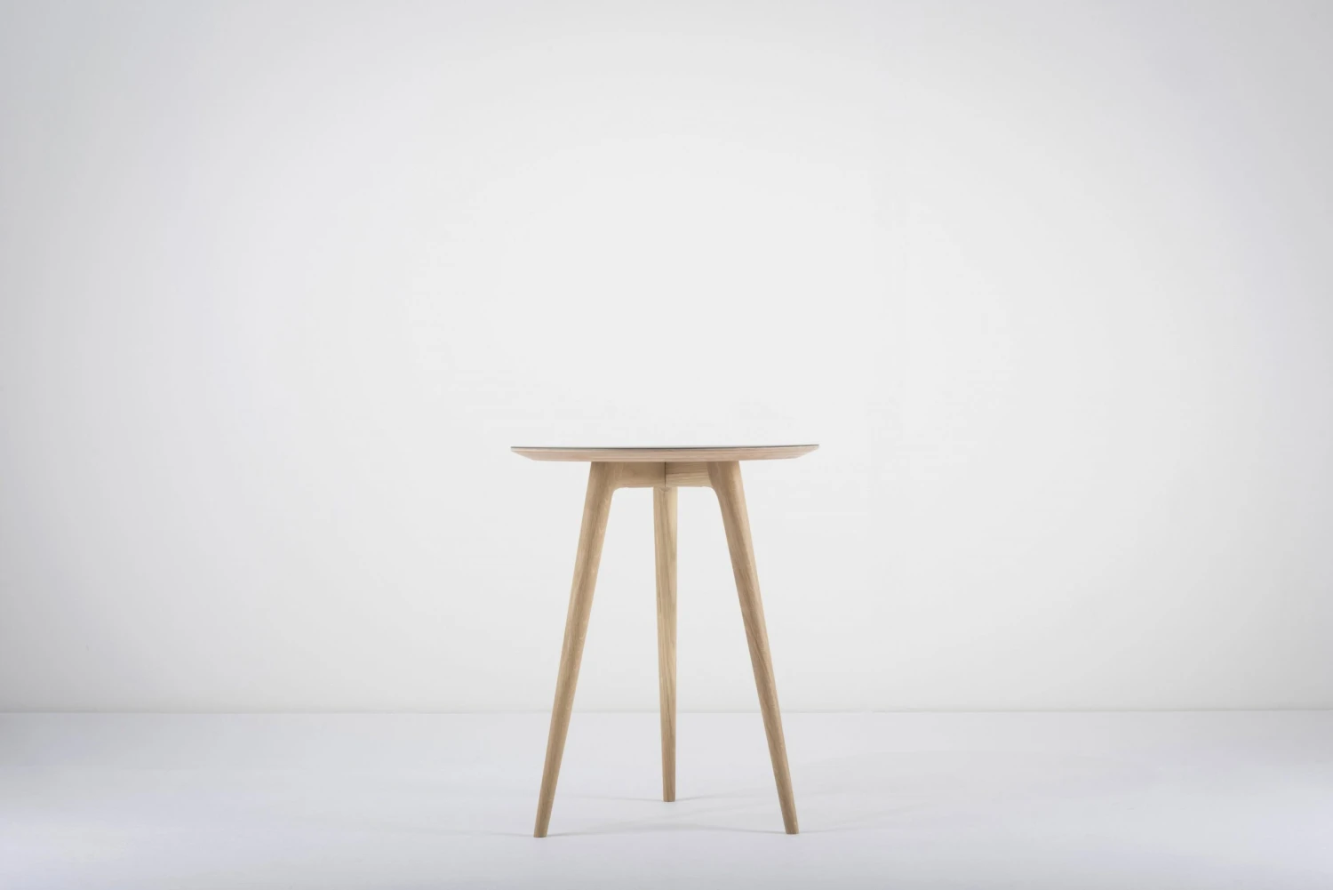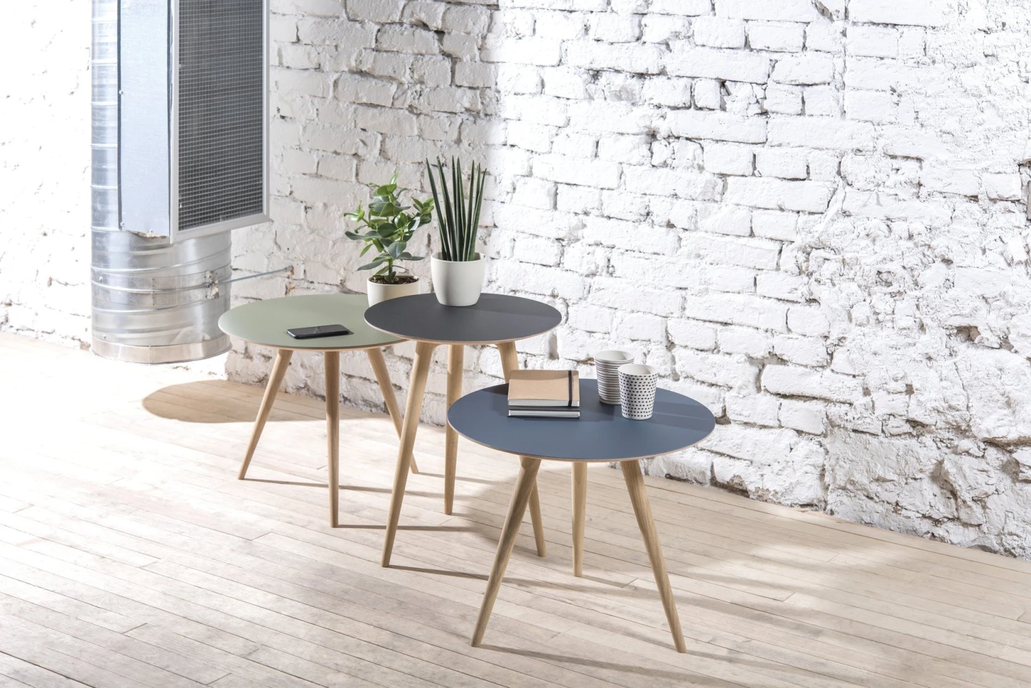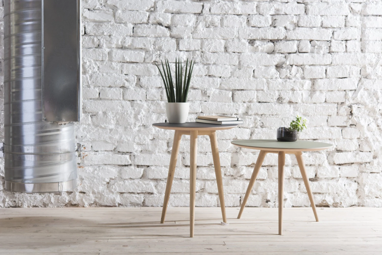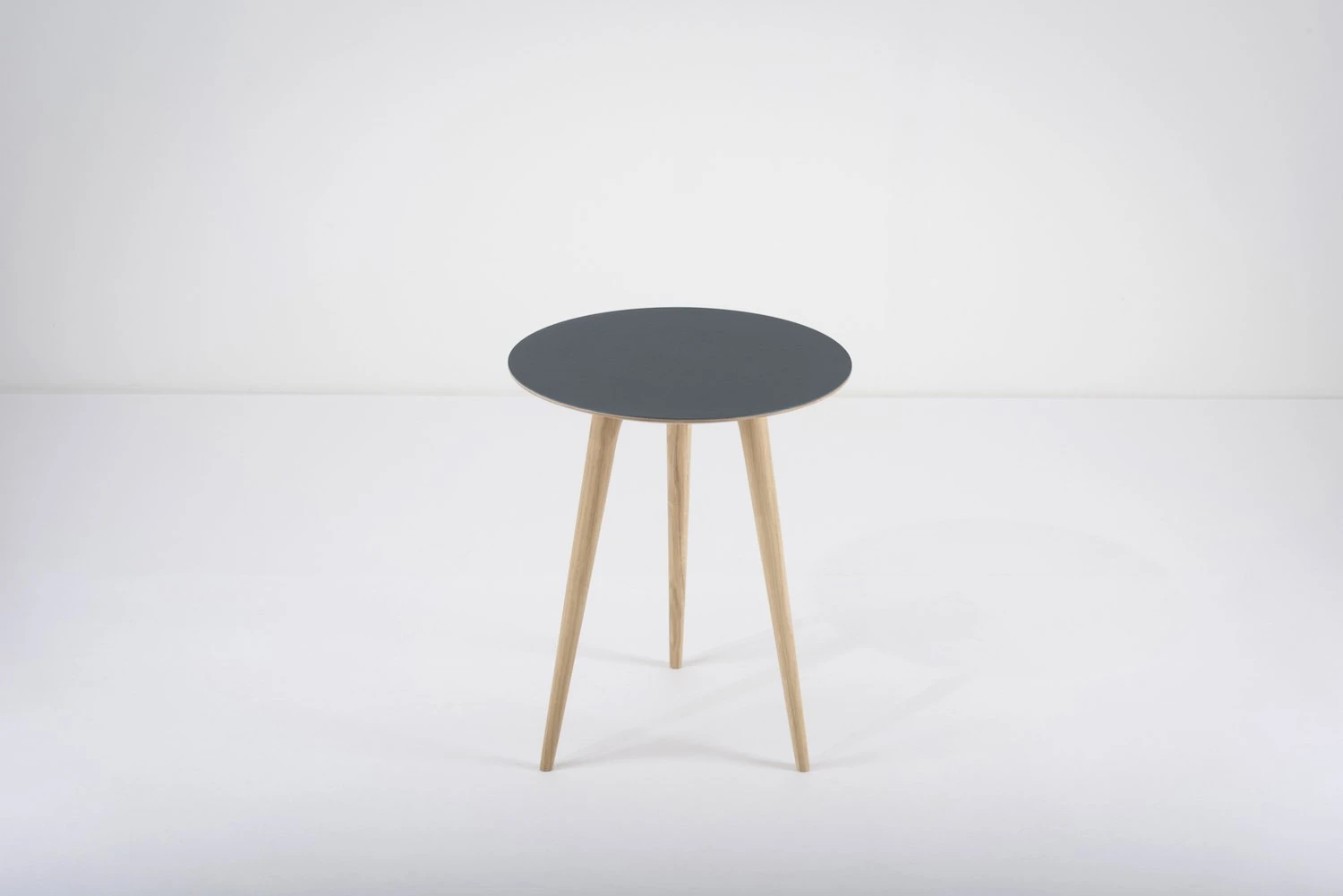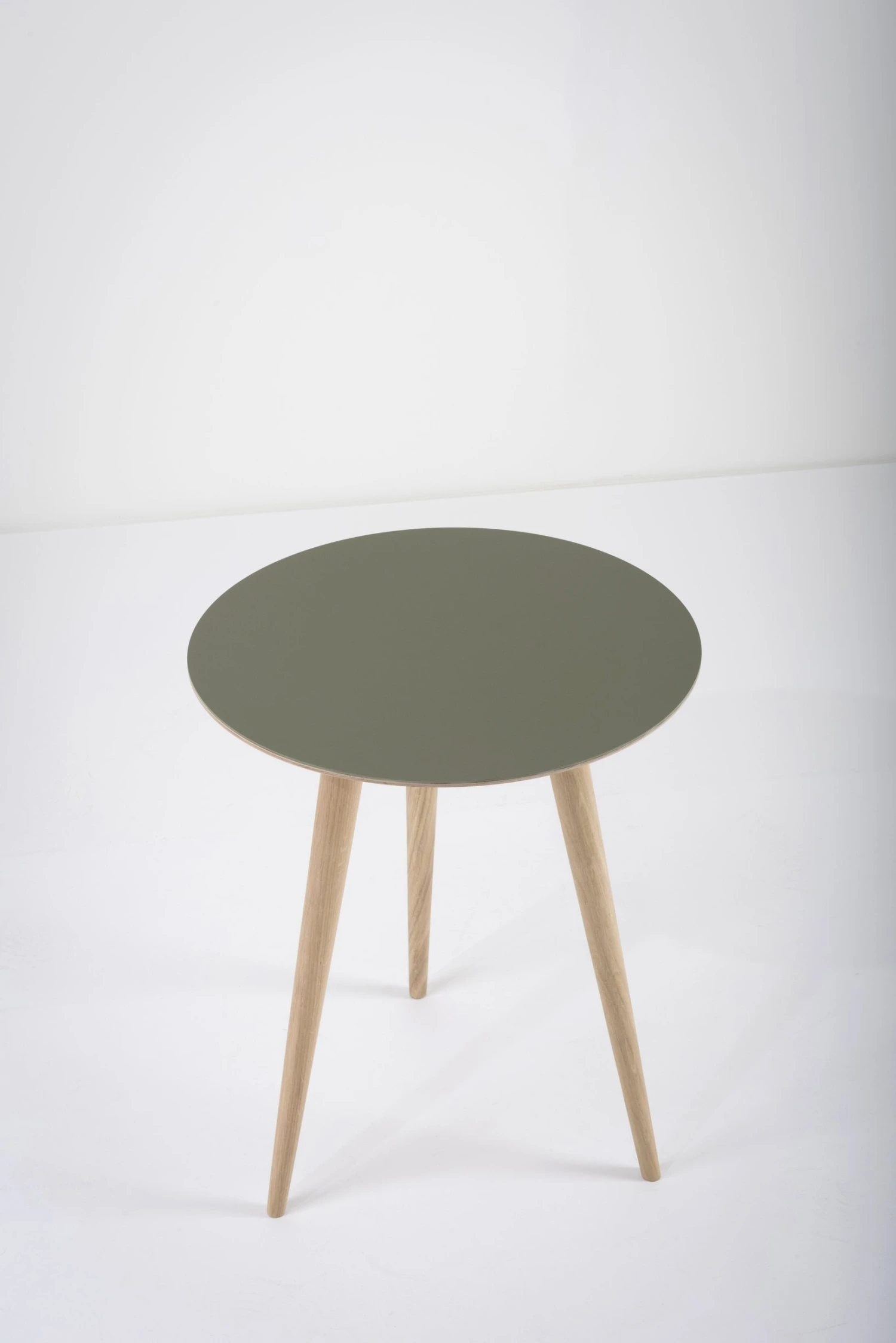 Es war Liebe auf den ersten Blick. Der Beistelltisch ARP von Gazzda vereint den Stil der 50er Jahr mit einer Qualität, die es damals nur selten gab. Echtes Linoleum, stabil verbunden mit massiver Eiche bildet die Tischplatte, des dreibeinigen Tisches.
