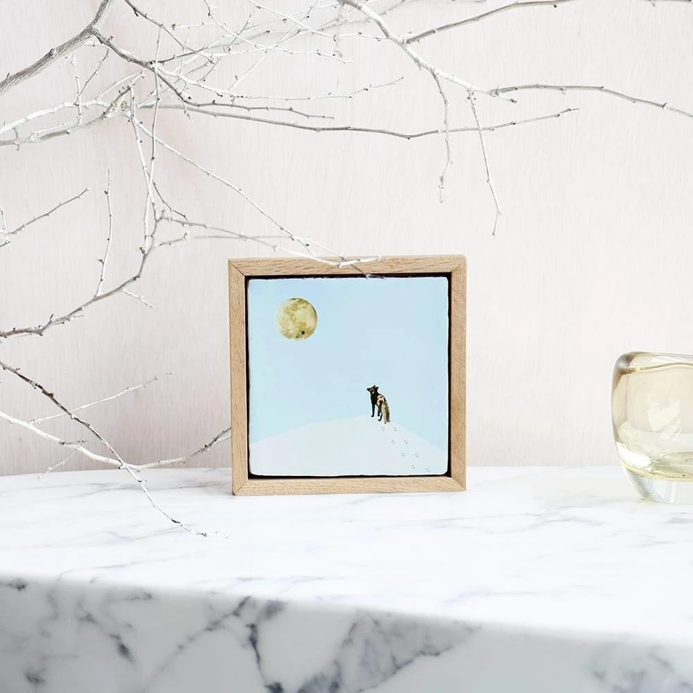 Es ist Vollmond und der Fuchs staunt über die runde Kugel am Firmament. Ein poetisches Winterbild auf einer handgemachten holländischen Fliese.