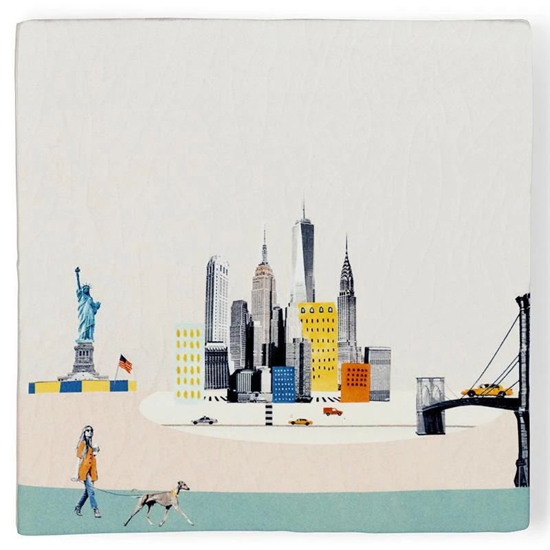 Eine New York – Collage auf einer Fliese. Die Fliese läßt uns die Stadt aus der Ferne betrachten. Die Freiheitsstatue und Wolkenkratzer.