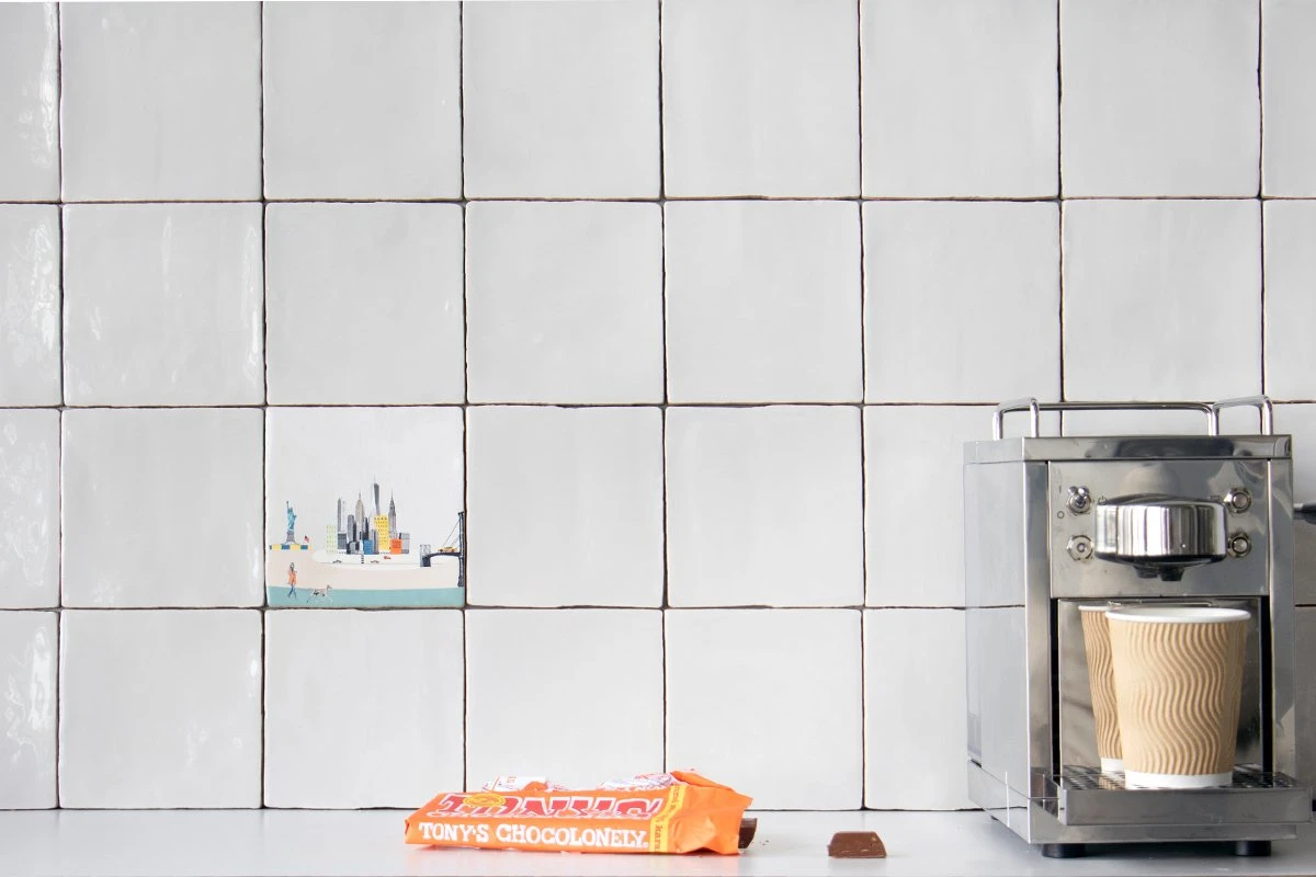 Eine New York – Collage auf einer Fliese. Die Fliese läßt uns die Stadt aus der Ferne betrachten. Die Freiheitsstatue und Wolkenkratzer.