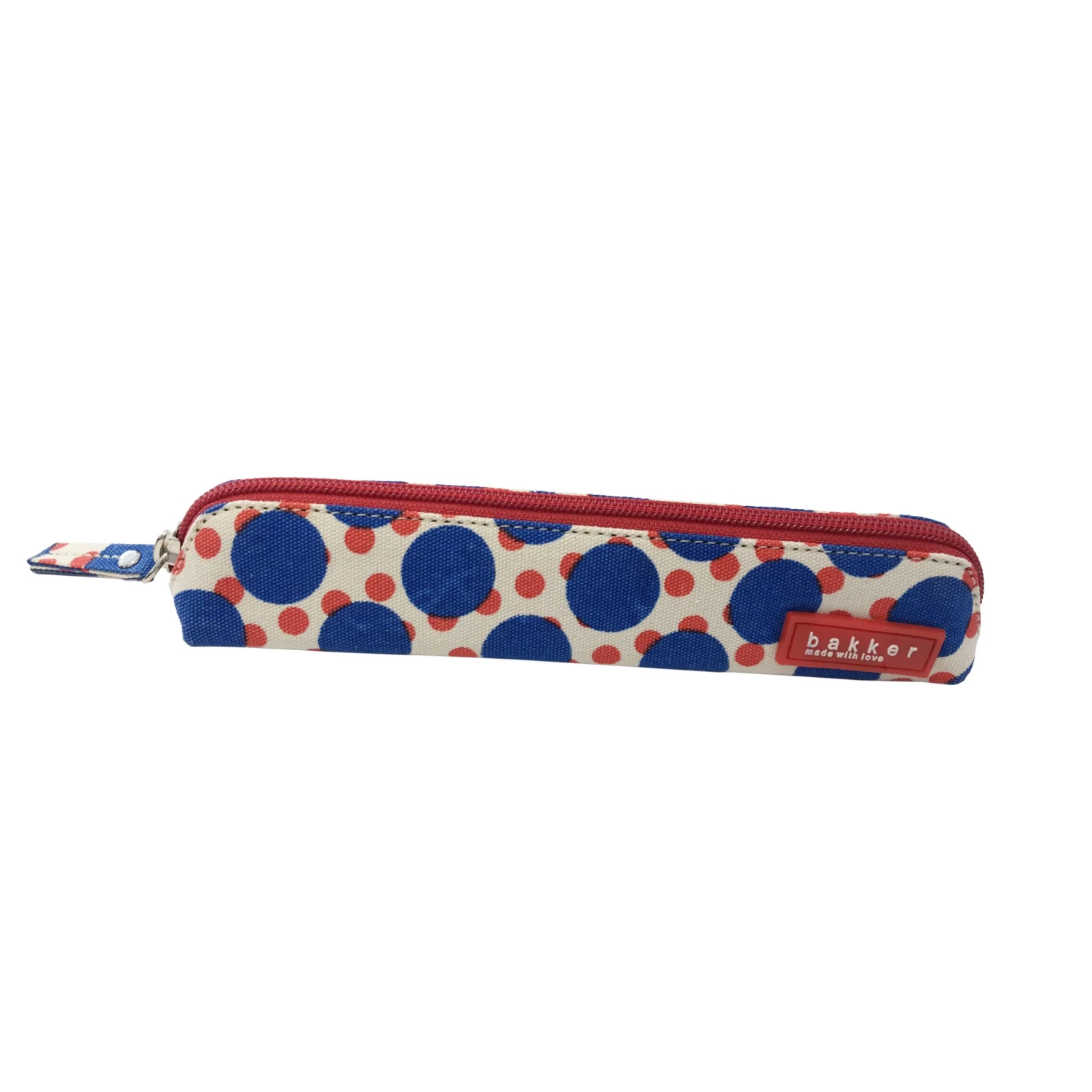 In dem Mini Stiftemäppchen aus steifer Baumwolle haben die wichtigsten Stifte Platz. Das besondere an diesen Stiftetäschchen ist der von Hand siebbedruckte Stoff mit fröhlichem rot blauem Muster dots.