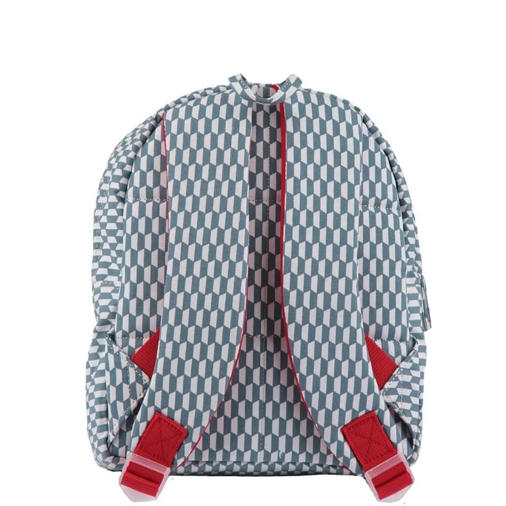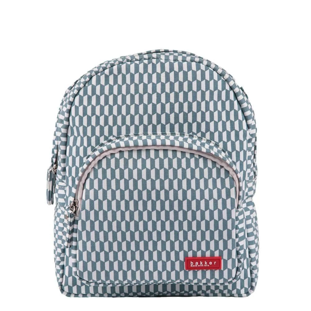 Rucksack aus stabilem Baumwolltwill, der mit einem grafischen Muster in taubenblau und weiß mit Siebdruck bedruckt ist.