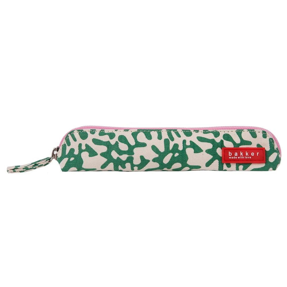 In dem Mini Stiftemäppchen aus steifer Baumwolle haben die wichtigsten Stifte Platz. Das besondere an diesen Stiftetäschchen ist der von Hand siebbedruckte Stoff mit grünem Muster.
