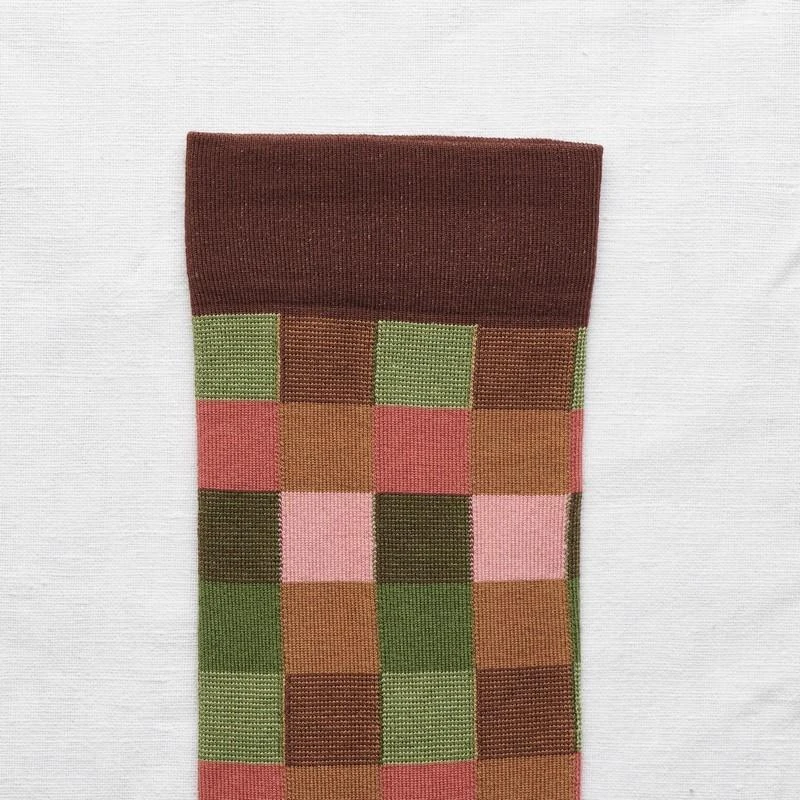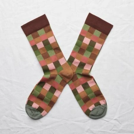 Die Socken von Bonne Maison machen Freude und überzeugen durch ihre besonders schönen Muster und Motive. Hier ist es ein lustiges Schachbrett aus Kästchen in braun, rosa, pink und grün.