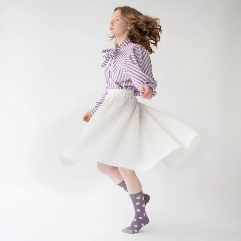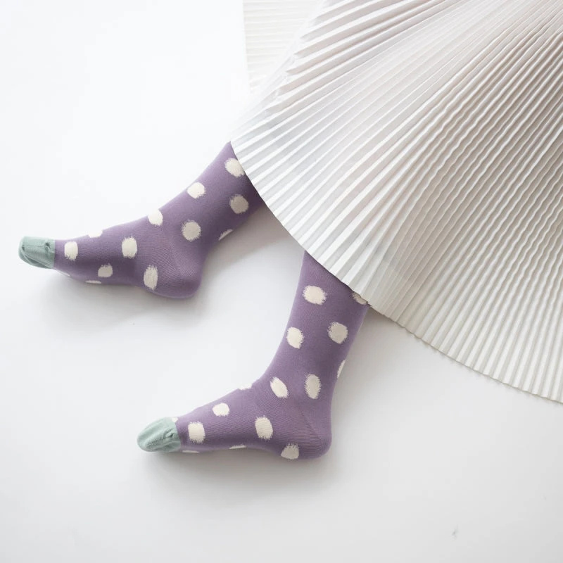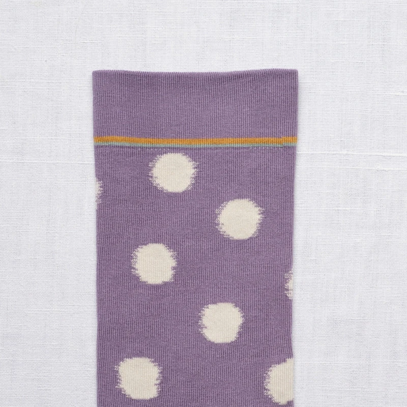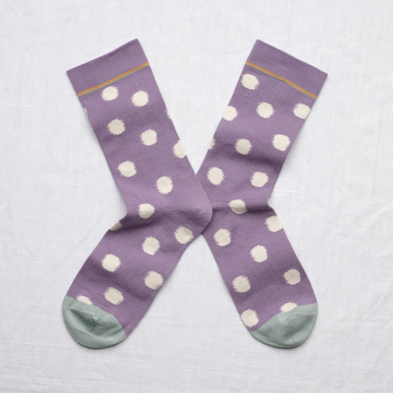 Lila Socken mit Tupfen? Ja! Die Polkadot- Socken von Bonne Maison wirken, als sei ihr Muster am Ikat- Webstuhl entstanden.