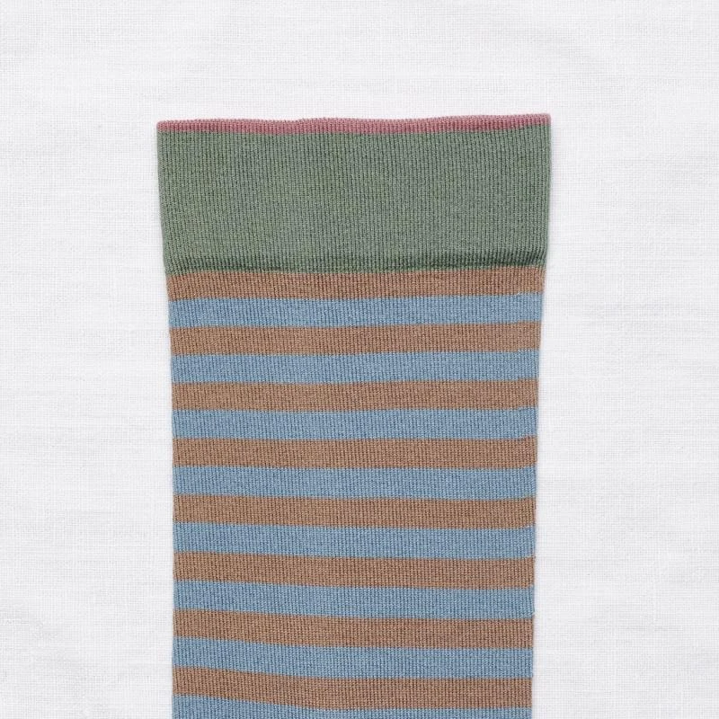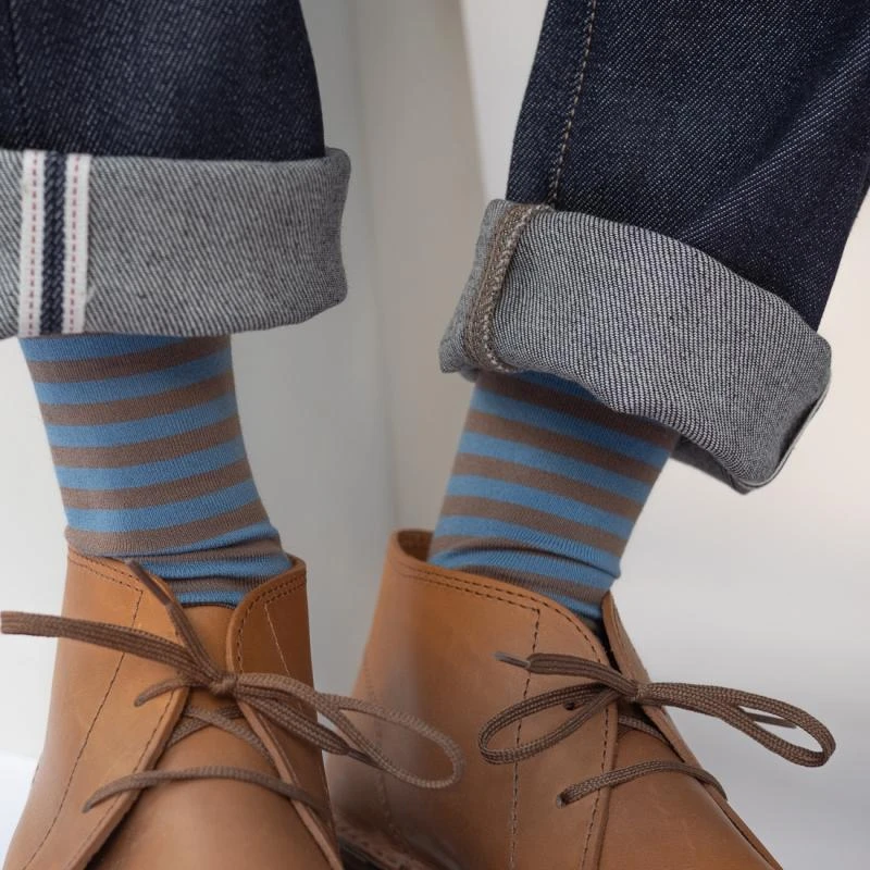 Ringelsocken in dem für das französche Familienunternehmen Bonne Maison ungewöhnlich zarten Tönen. Taupe, braun und lindgrün vereinen sich zu einer harmonischen Socke.