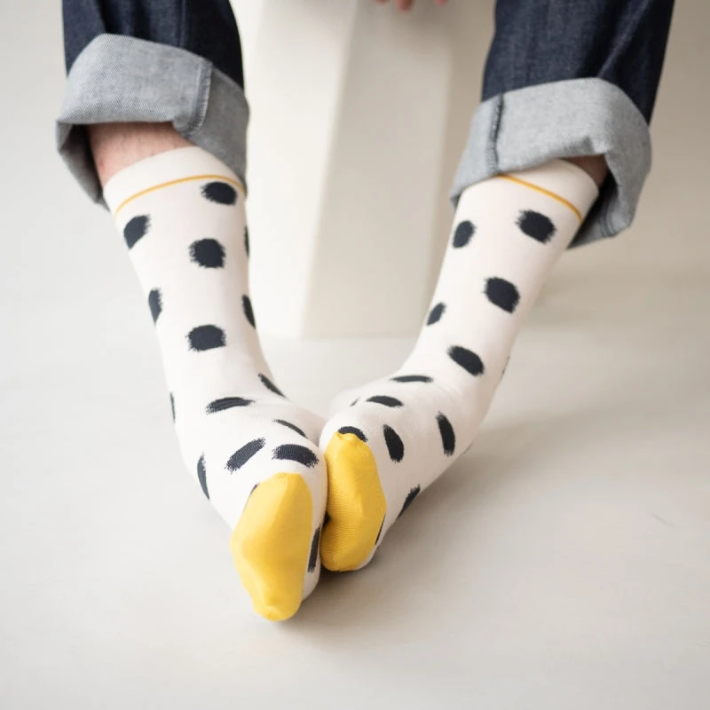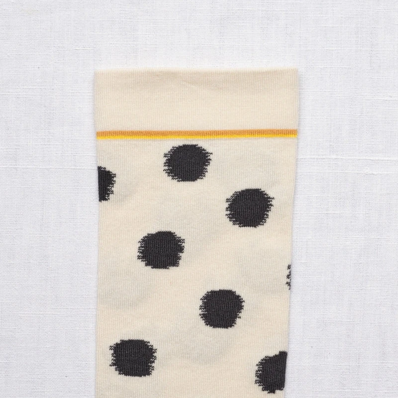 Naturweiße Socken mit nachtblauen Punkten. Die Polkadot- Socken von Bonne Maison wirken, als sei ihr Muster am Ikat- Webstuhl entstanden.