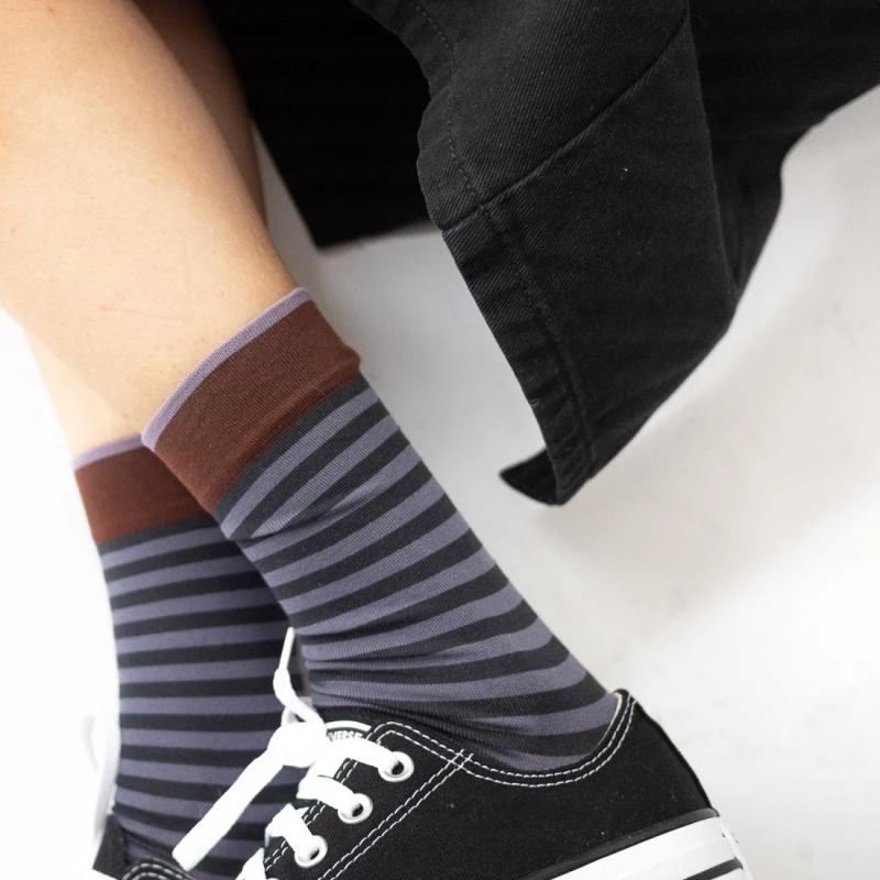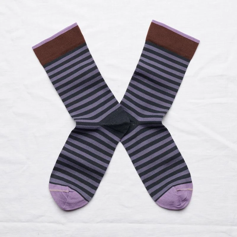 Lustige Streifensocken in dunklen Violett – Farbtönen. Die tolle Sockenmarke Bonne Maison macht Fußkleidung für Menschen mit Humor. Ein bisschen erinnern diese Exemplare an das starke Mädchen aus der Kinderweltliteratur.