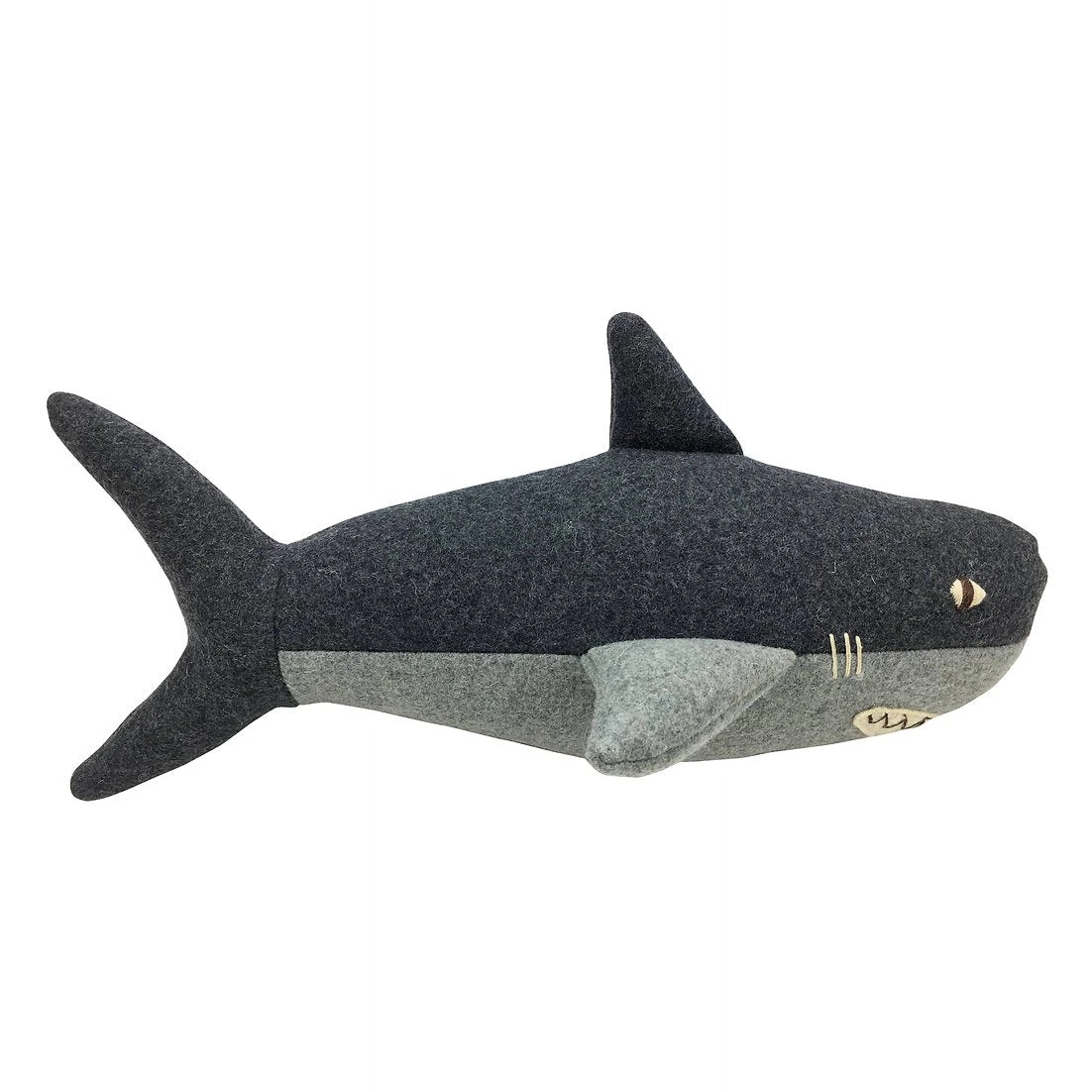 Der Hai Ben aus der portugiesischen Manufaktur Carapau schwimmt gerne durchs Kinderzimmer. Sein Körper aus schönem Wollfilz macht ihn zu einem gemütlichen Spielgenossen, auch wenn das aufgestickte Gebiss, ziemlich imposant ist.