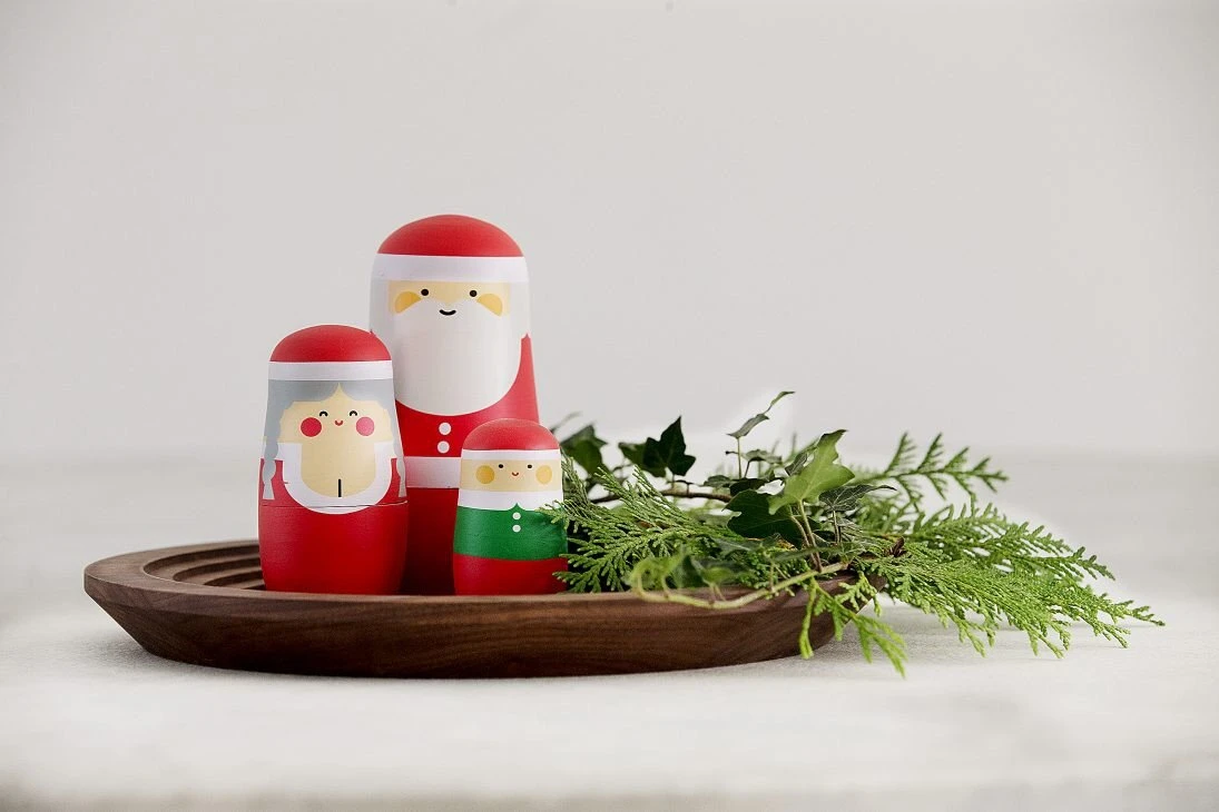 Der dänische Designer Benjamin Hansen verpasst den russischen Matroschkas ein modernes, humorvolles Gesicht. Das Christmas -Set besteht aus Weihnachtsmann, Weihnachtsfrau und Weihnachtselfe.