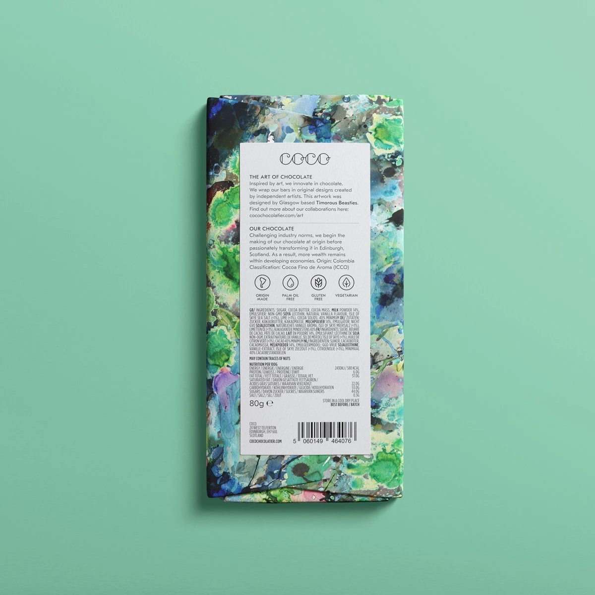 Zutaten: Zucker, Kakaobutter, Kakaomasse, Milchpulver, Emulgator: Non-GMO Sojalecithin, natürliches Vanillearoma, Isle of Skye Meersalz (1%), Limette (1 %). Allergene: Milch, Soja. Keine glutenhaltigen Zutaten.