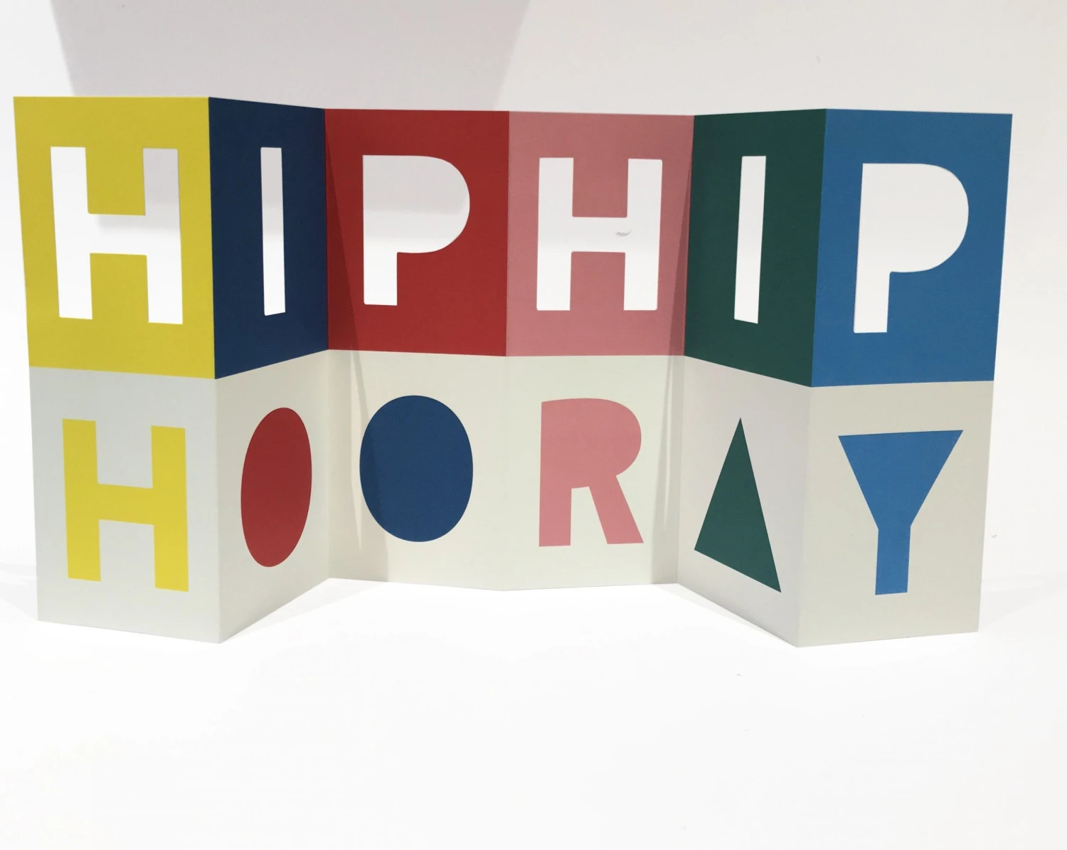 Bedruckt mit bunten Flächen und gestanzten Buchstaben.