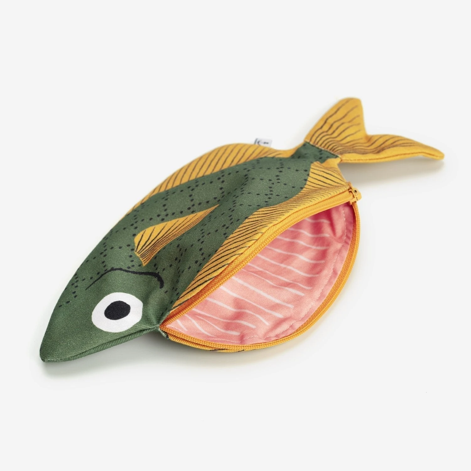 Ein Fischtäschchen von Don Fisher aus Spanien. Tolles Design, siebgedruckter Baumwollstoff in grün mit gelben Flossen und lachsrosa Futter. Geeignet für Schminkzeug, Stifte und allerlei anderem Krimskrams in der Handtasche.