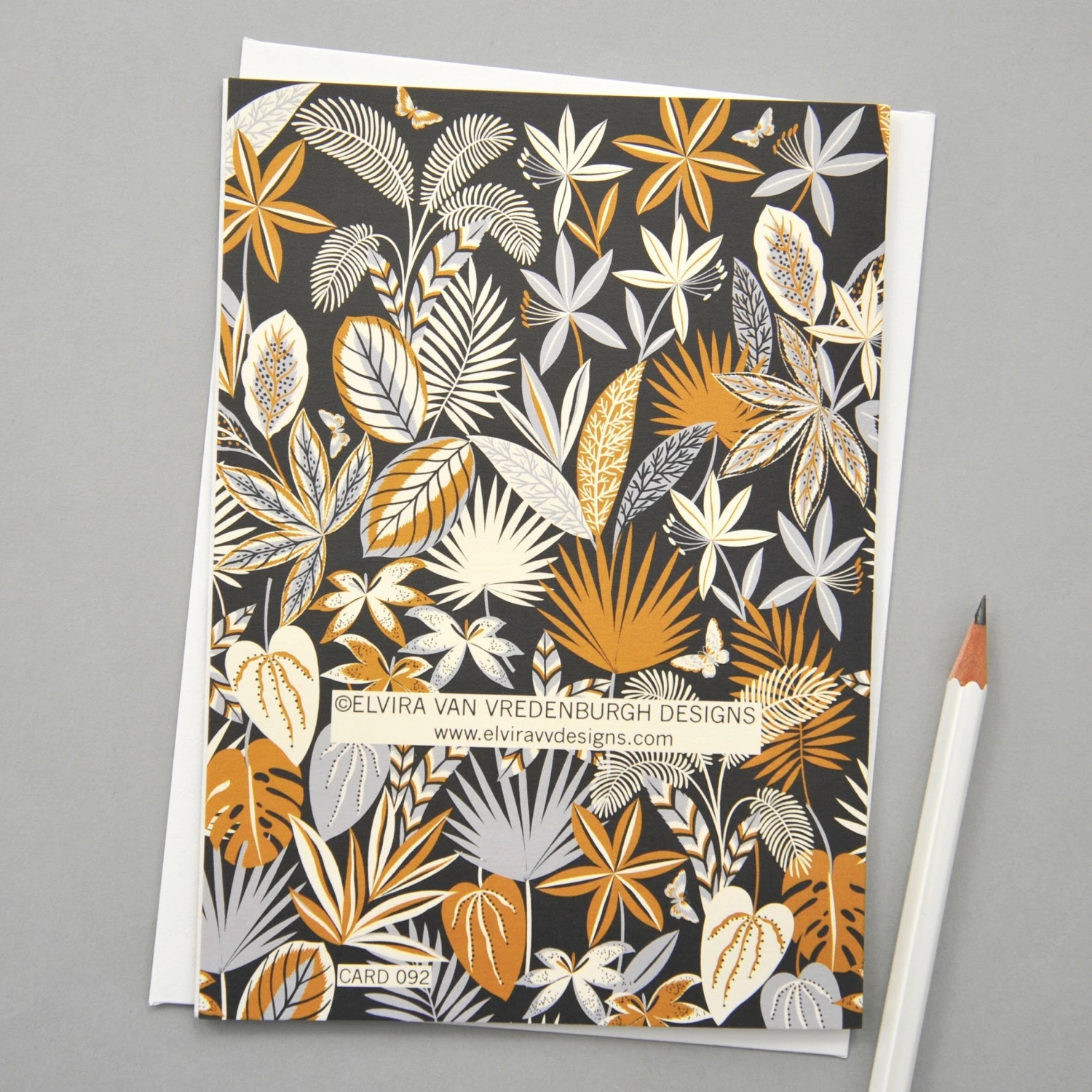 Eine große florale Grußkarte der Londoner Designerin Elvira van Vredenburgh. Die Karte zeigt verschiedene florale Motive in lebendiger Komposition.