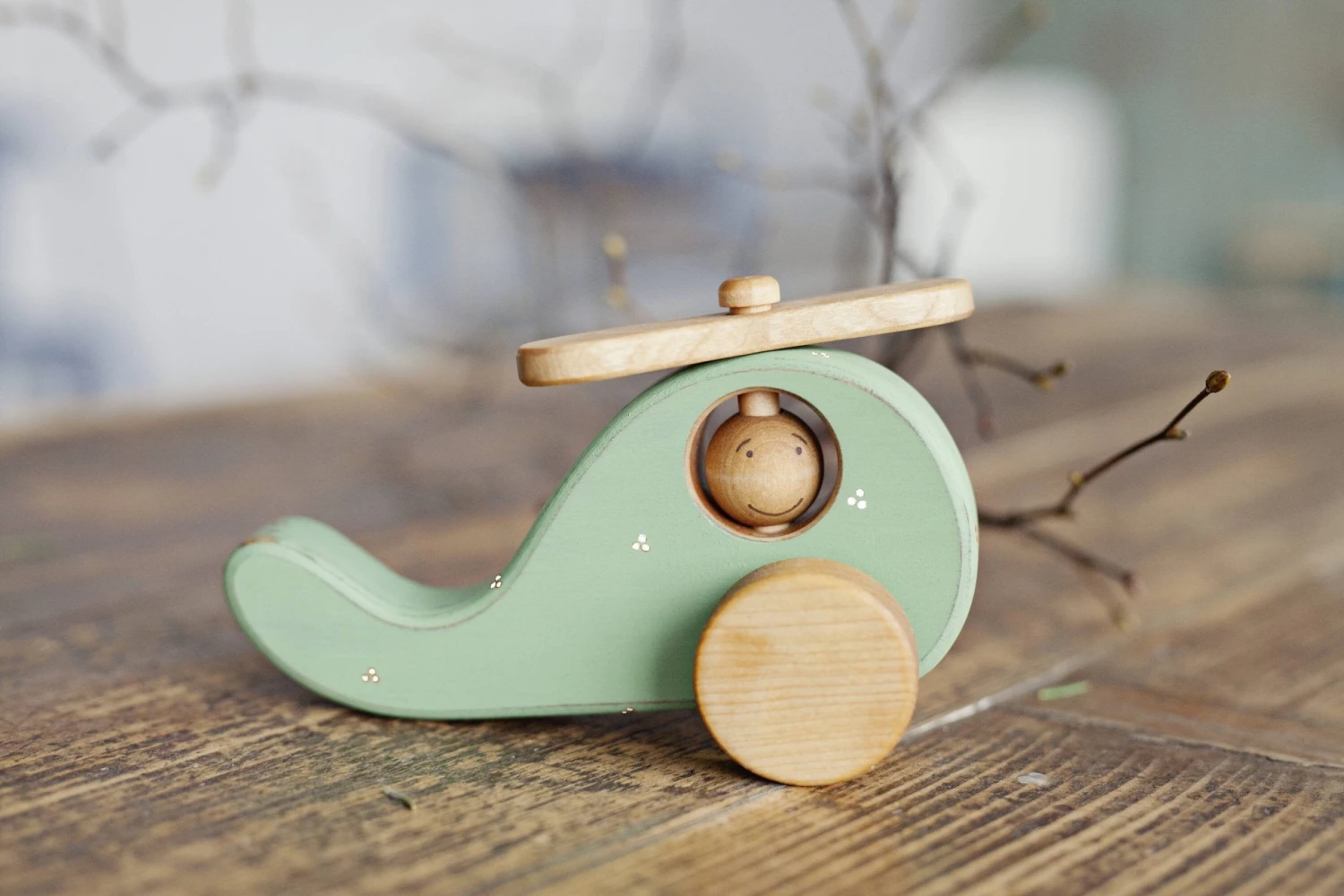 Ein organisch geformter Hubschrauber aus Birkenholz. Aus fen Fenster guckt der Pilot. Der Propeller lässt sich bewegen.