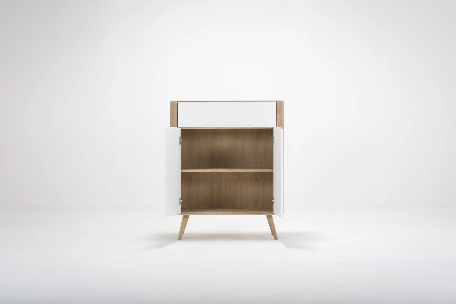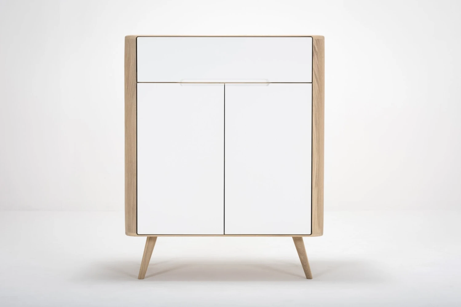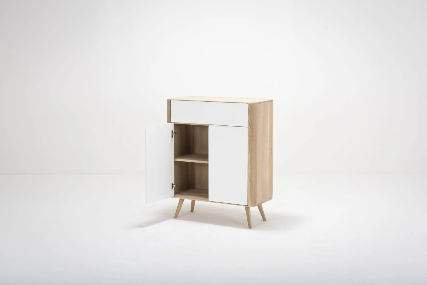 Das Schränkchen verfügt über eine Schublade und zwei Flügeltüren mit Soft-Close- Scharnieren, die Zugang zu zwei Fächern verschaffen. Mit 42cm Tiefe eignet es sich auch als Möbelstück für viele Flure.