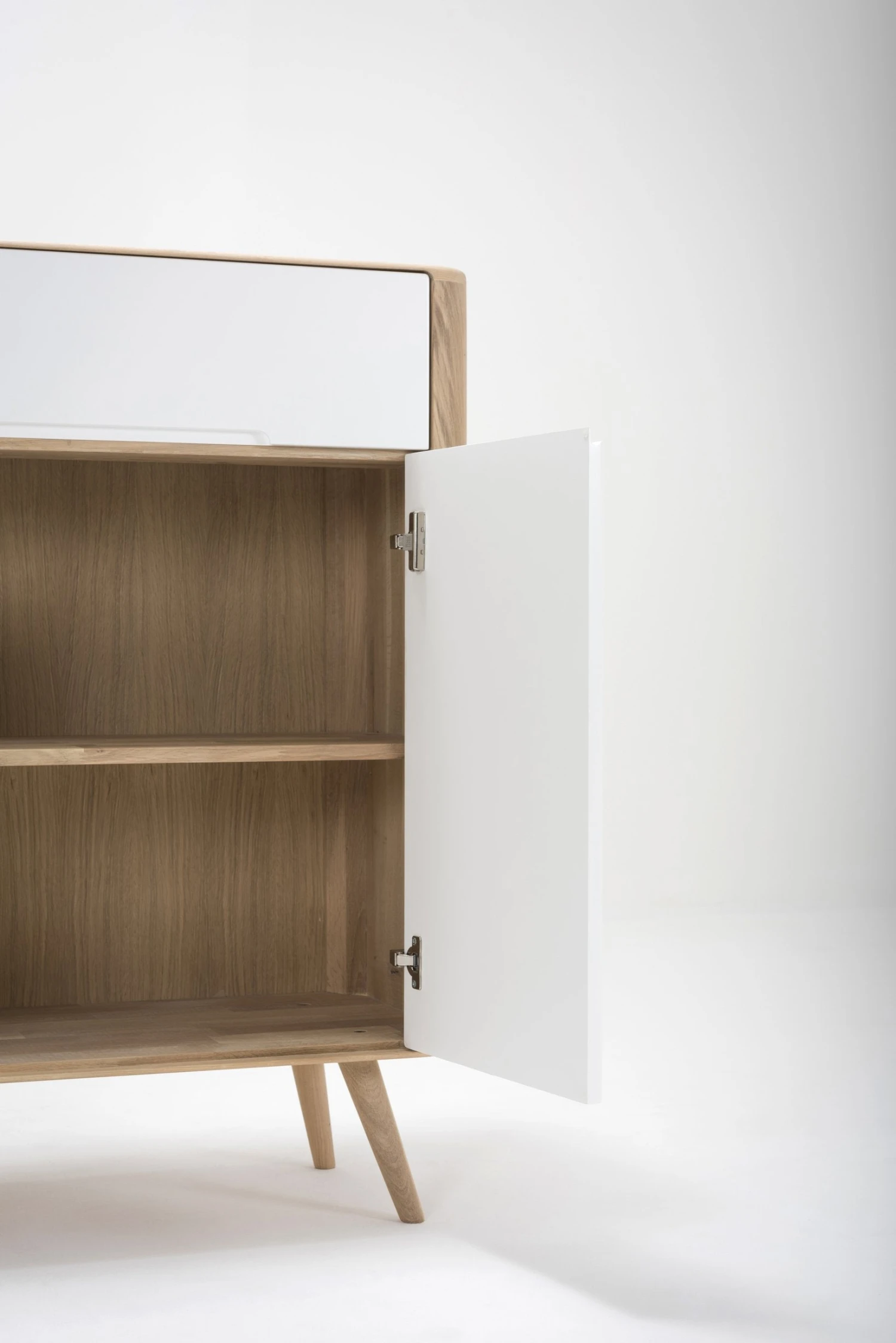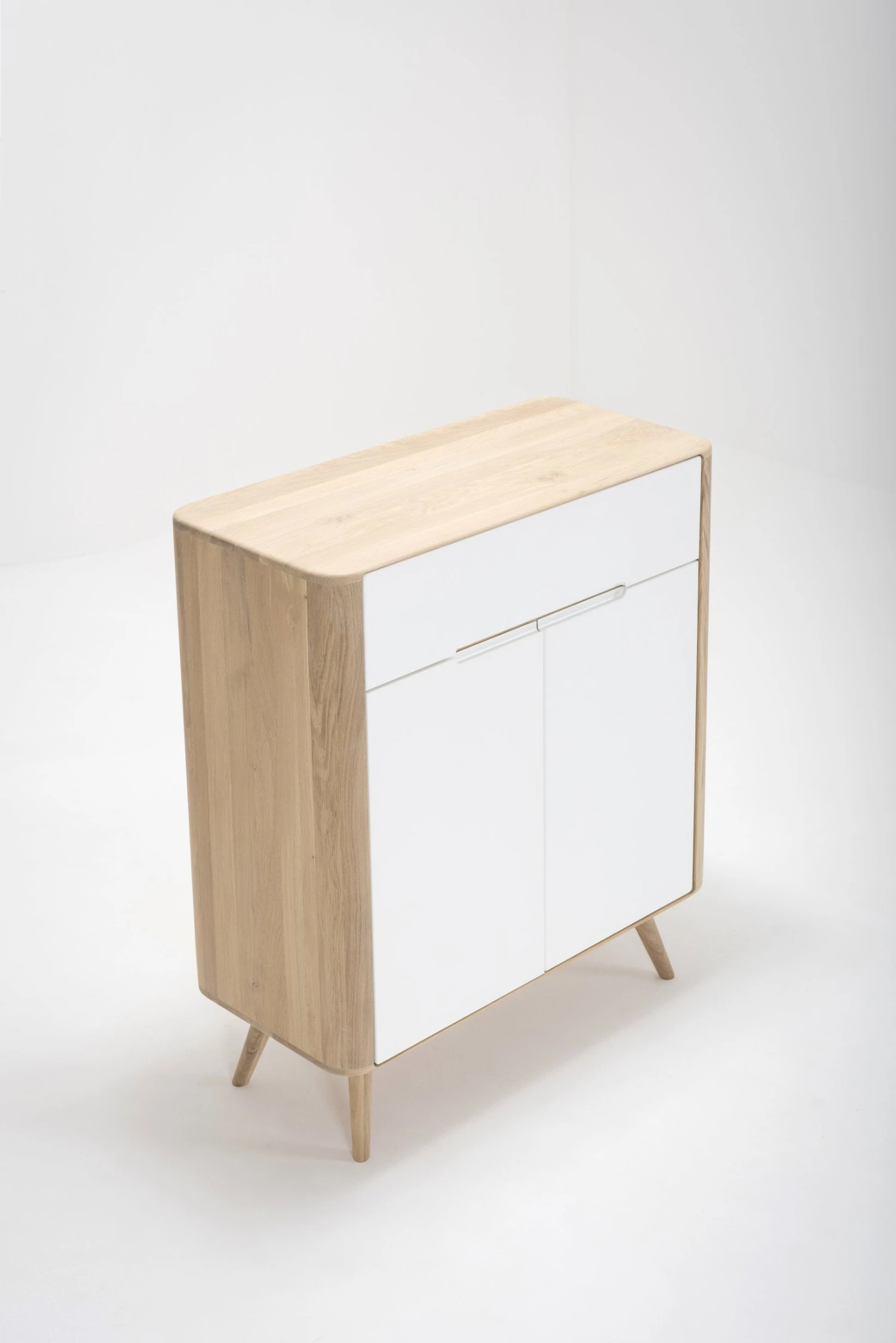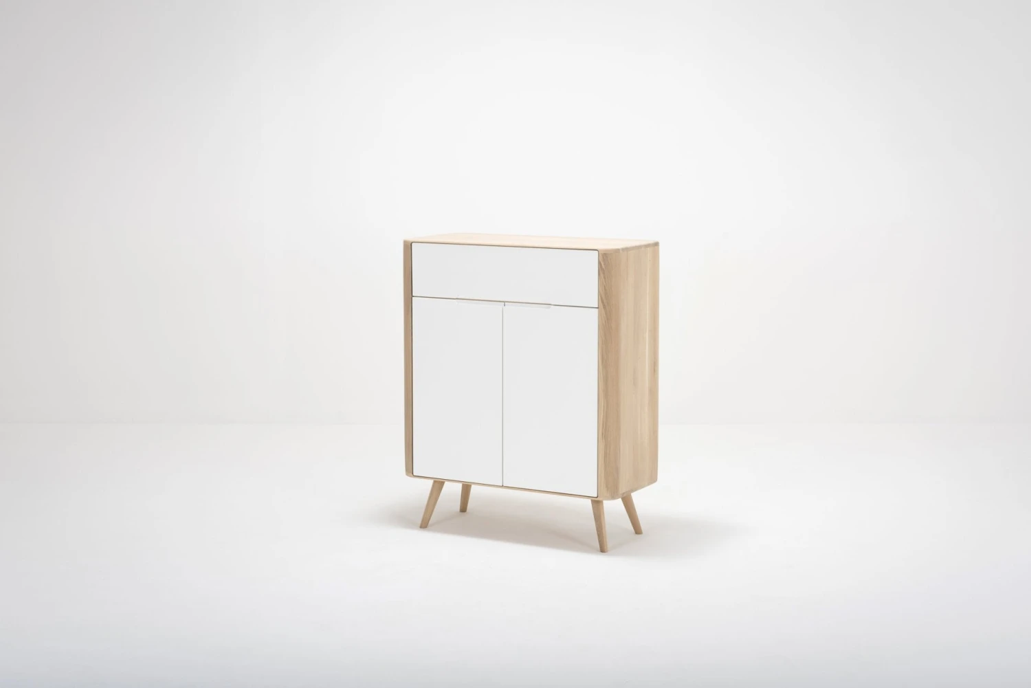 Das Schränkchen verfügt über eine Schublade und zwei Flügeltüren mit Soft-Close- Scharnieren, die Zugang zu zwei Fächern verschaffen. Mit 42cm Tiefe eignet es sich auch als Möbelstück für viele Flure.