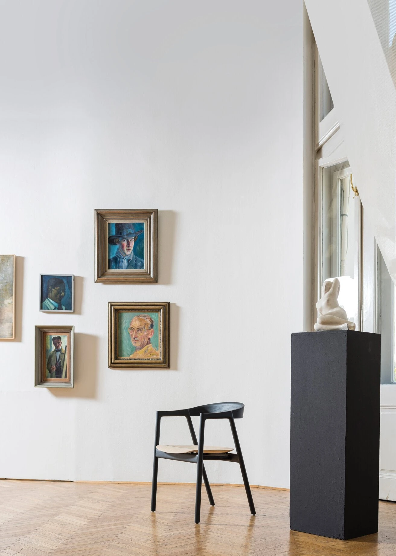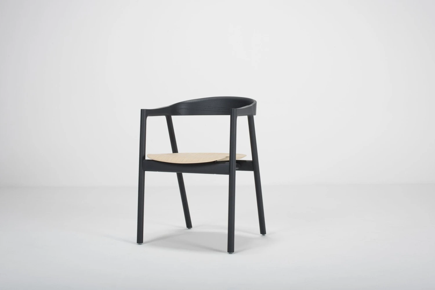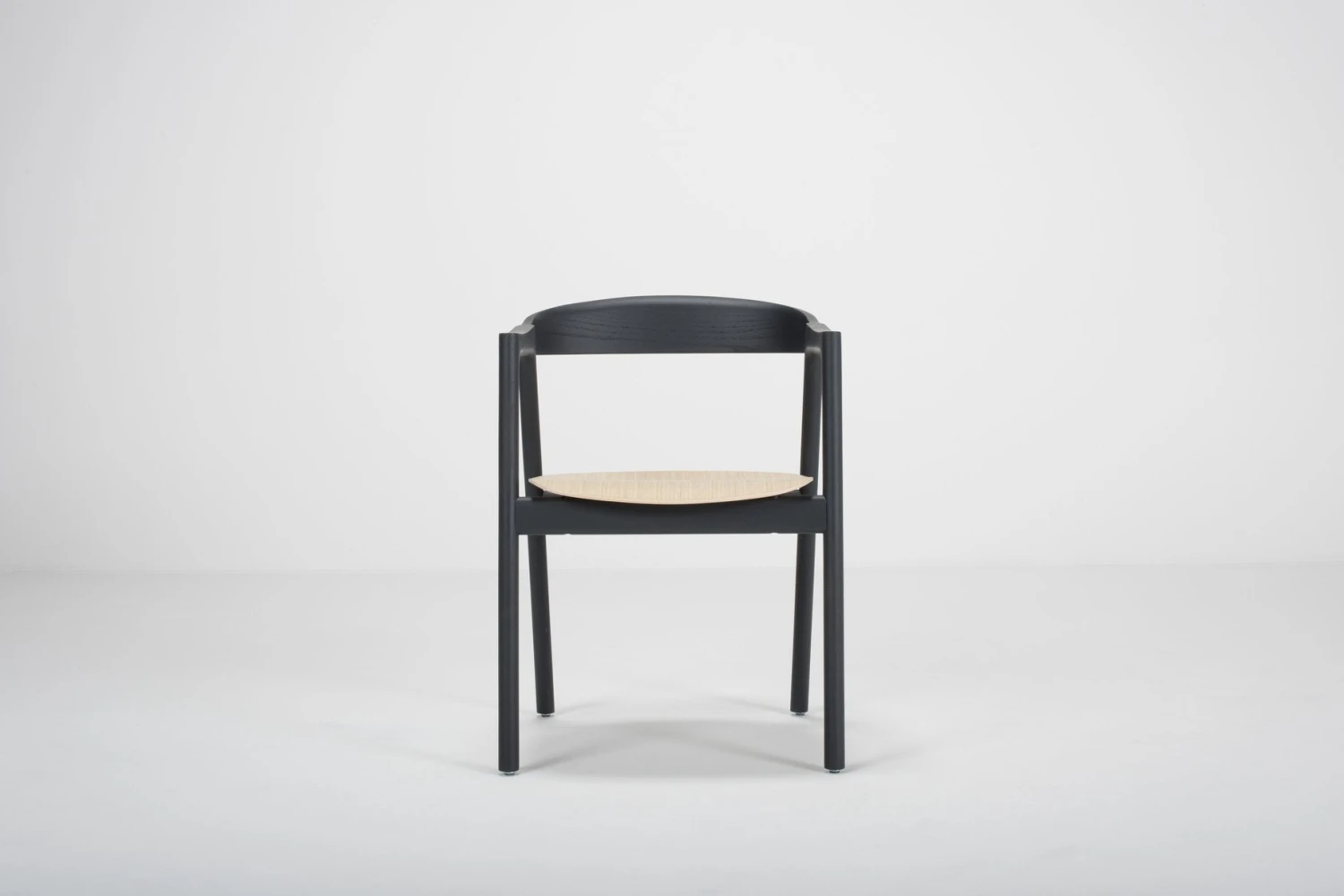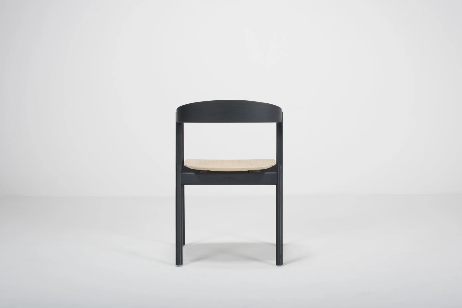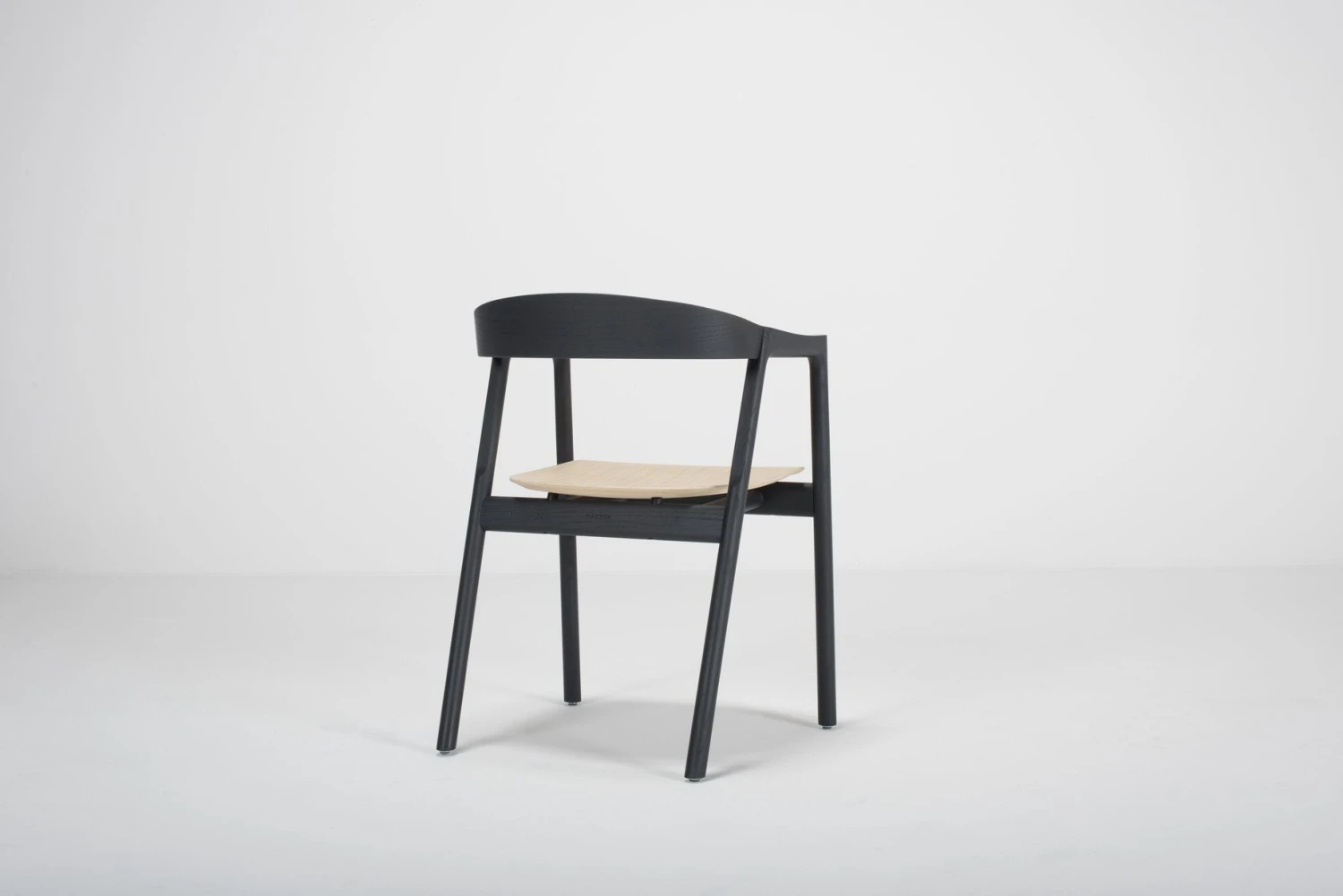 Der schwarze bzw. dunkelgraue Stuhl ist aus lackierter Eiche hergestellt. Die Sitzfläche ist aus hellem Furnier, Gestell und Rückenteil aus Massivholz.