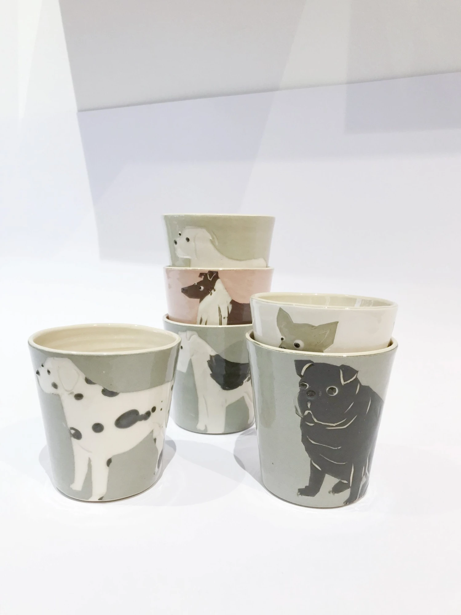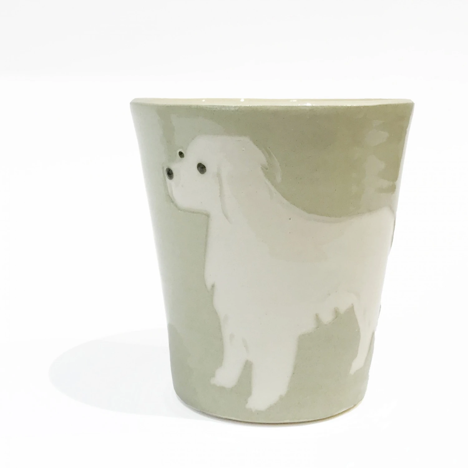 Ein weißer Golden Retriever ziert diesen Kaffeebecher in Sandfarben.