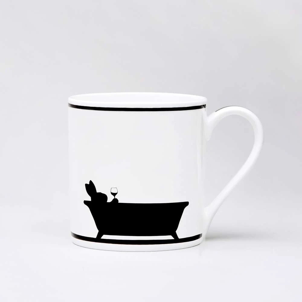 Auf dieser Tasse genießt das Häschen ein Glas Wein in der Badewanne.