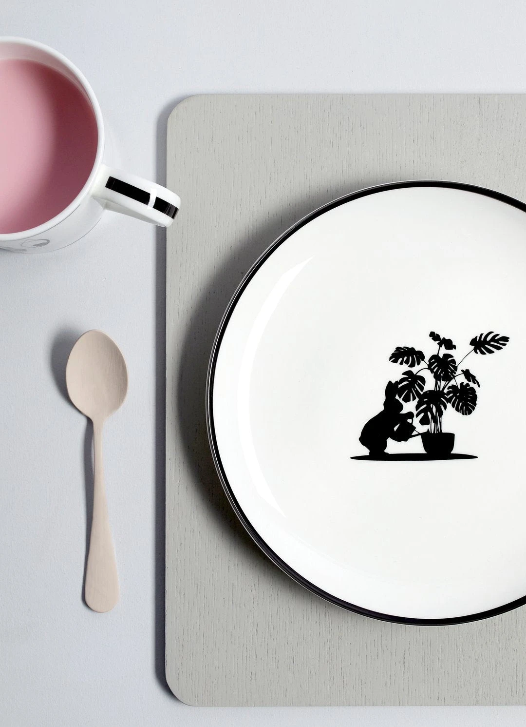 Auf diesem Teller gießt der Hase mit dem grünen Daumen eine Monstera, seine Zimmerpflanze.