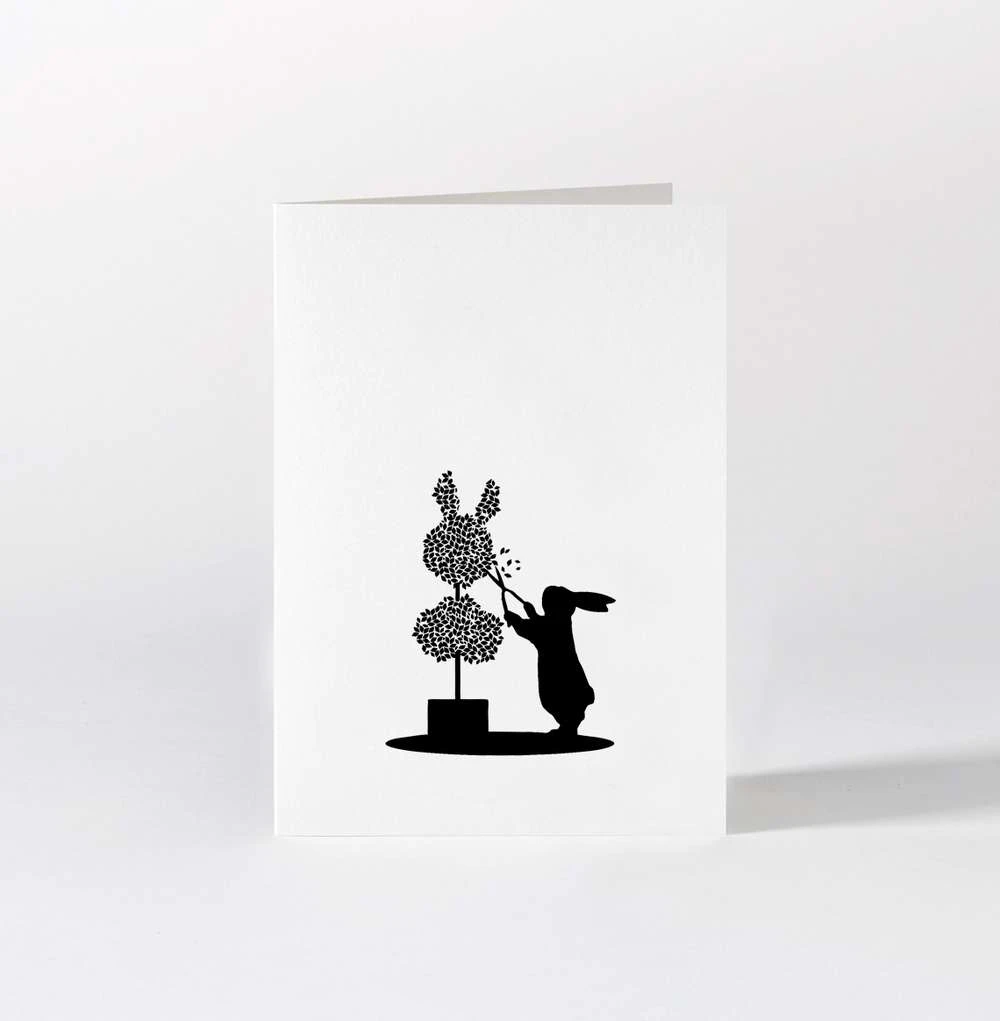 Auf dieser Karte schlüpft das Häschen in die Rolle des routinierten Gärtners und beschneidet einen Buchsbaum.
