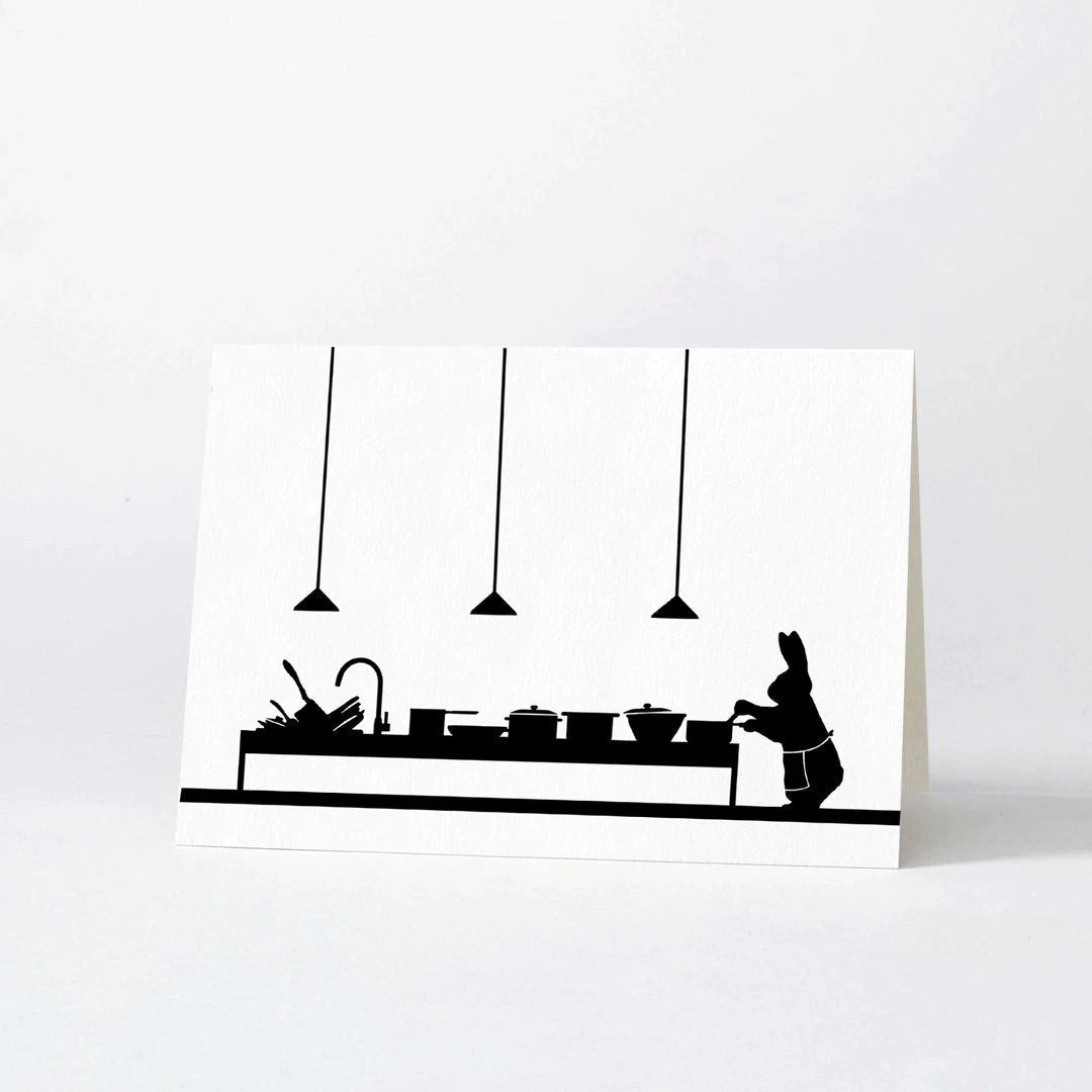 Auf dieser Karte kocht der Hase in einer schicken Küche.