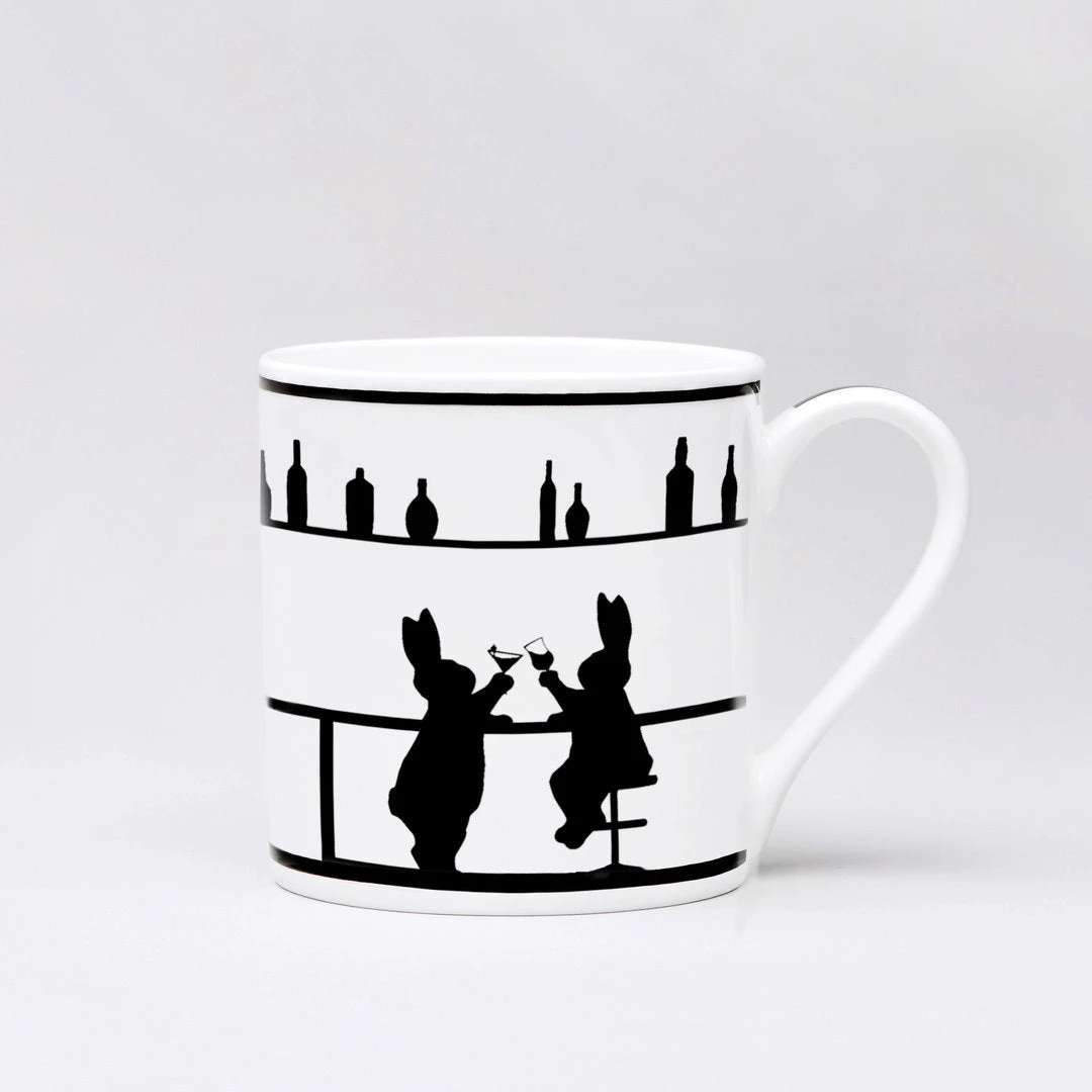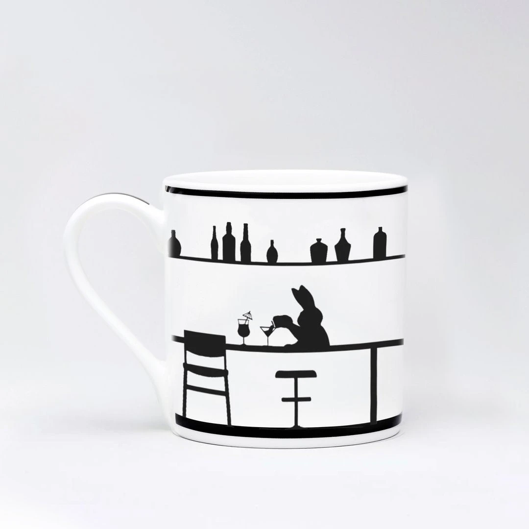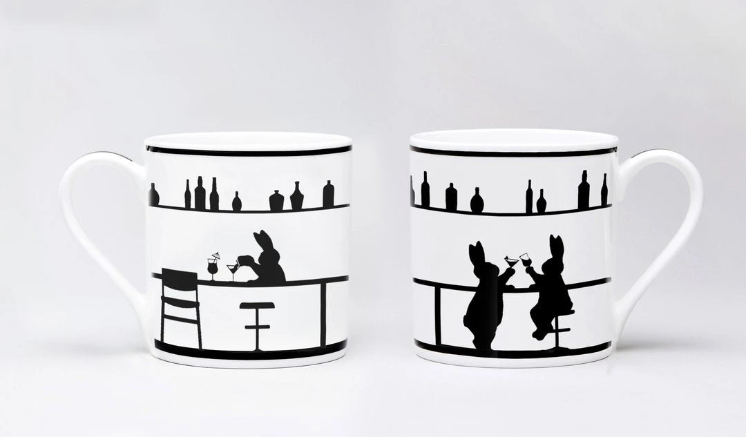 Wieder Lust auf Ausgehen? Auf dieser Tasse stoßen zwei Häschen mit ihren Cocktails an. Auf der anderes Seite der Bar mixt der Barkeeper.