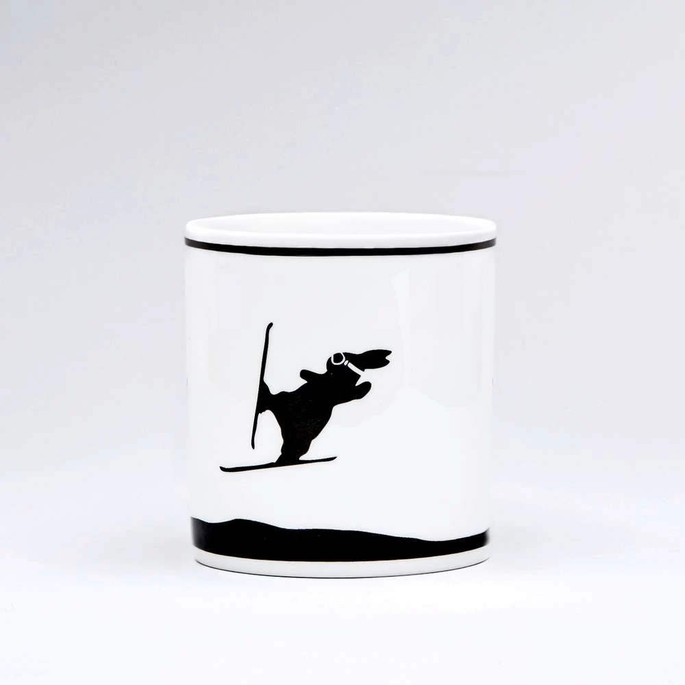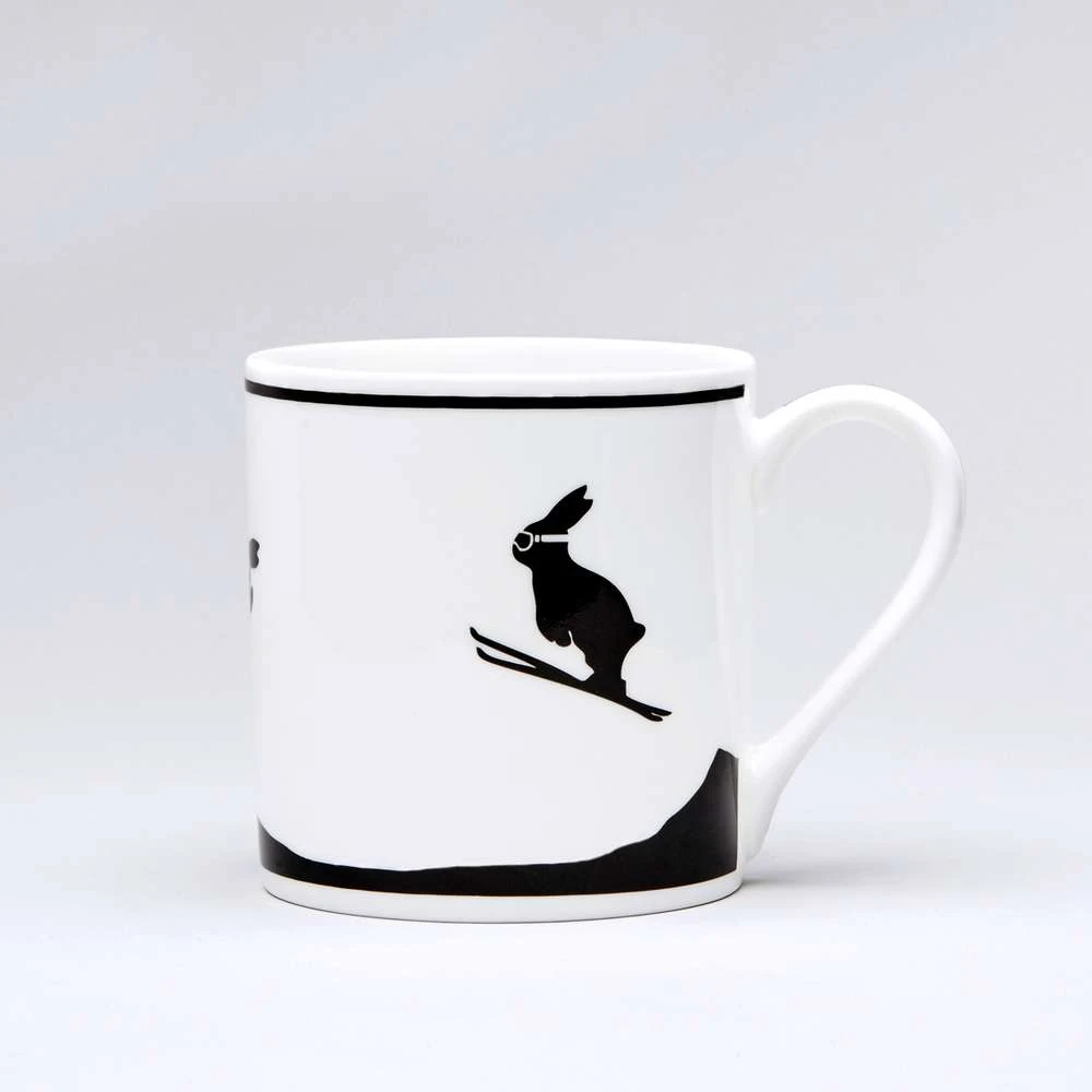 Auf dieser Tasse springt das Häschen mit Skiern über Horizont.