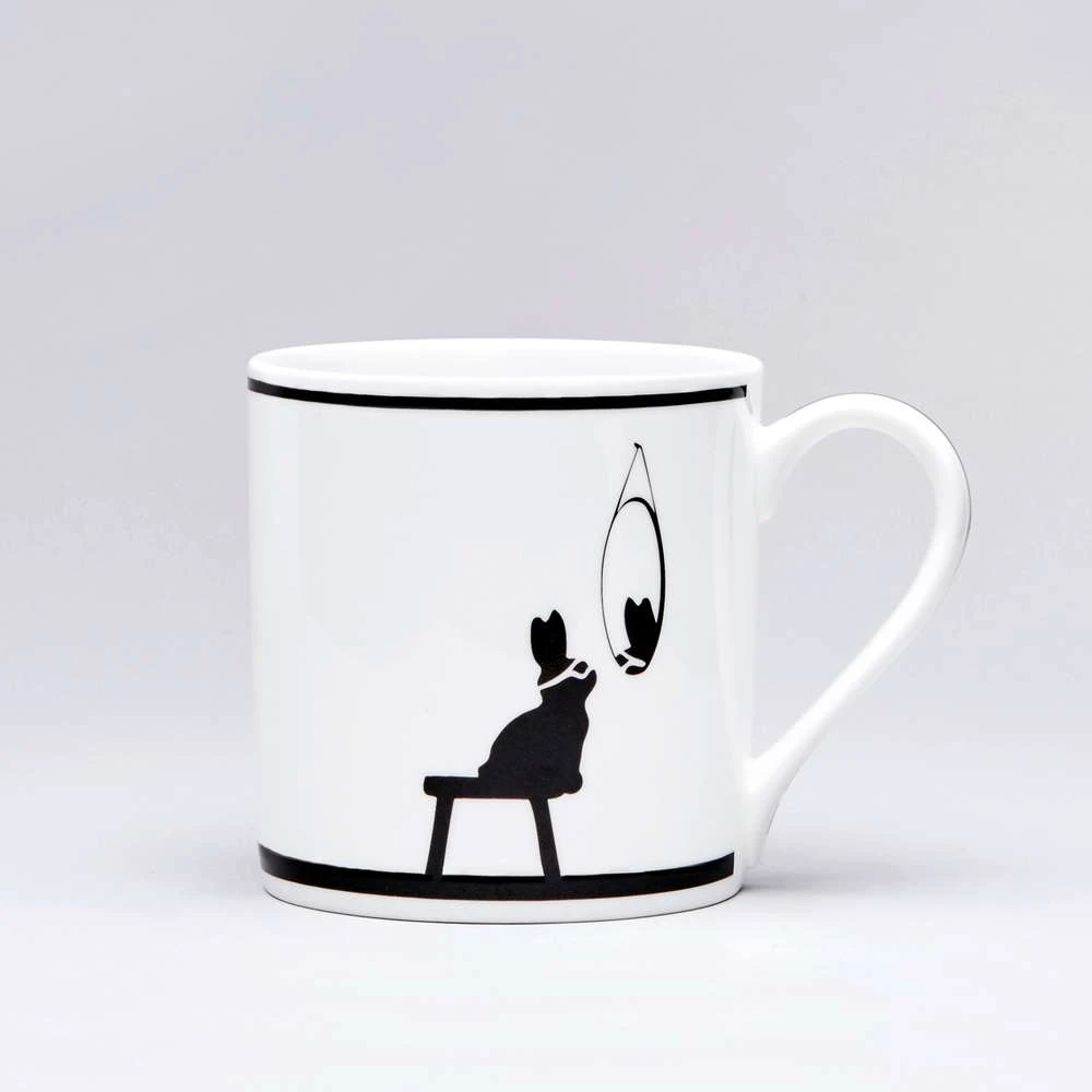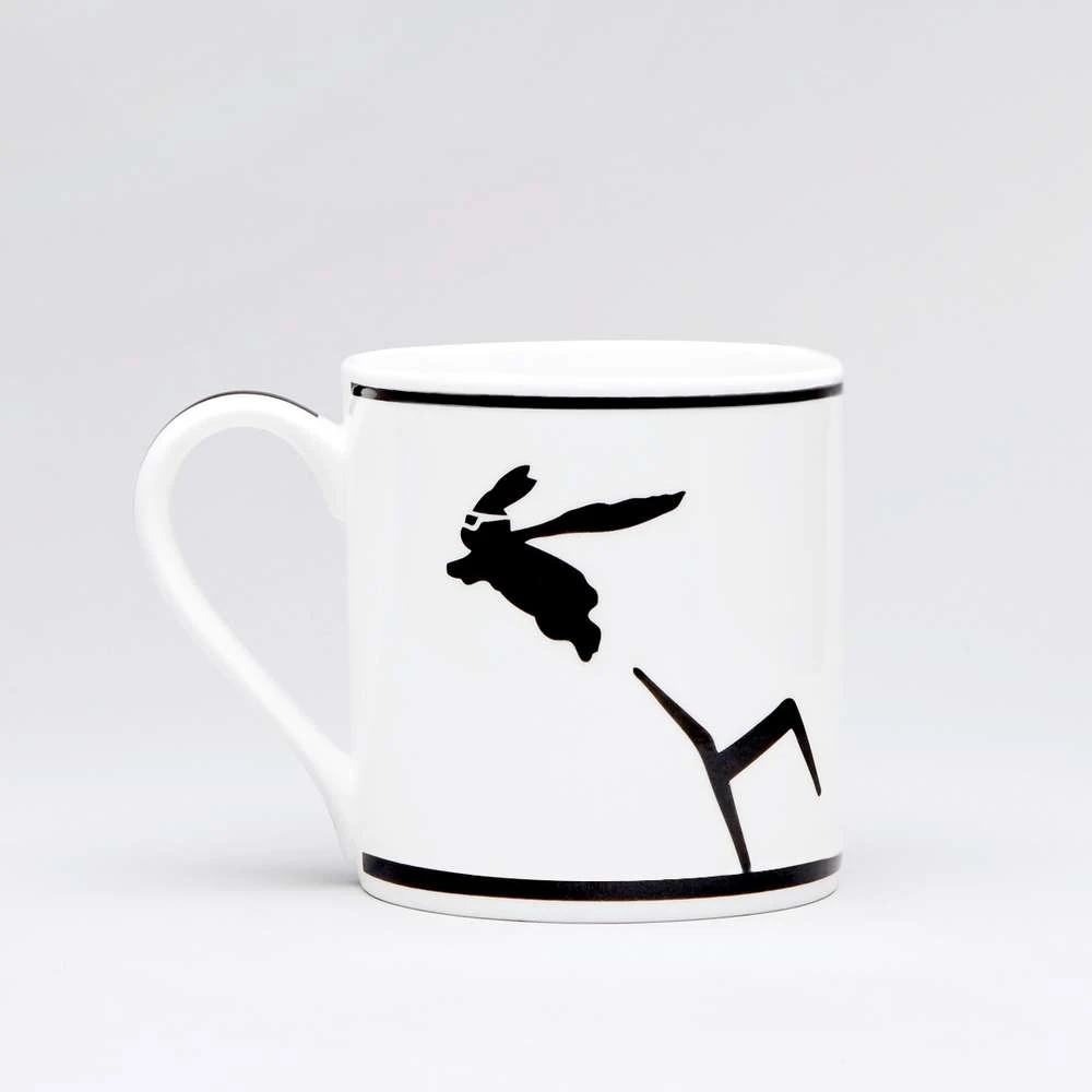 Auf dieser Tasse sind die Hasen Superhelden auf dem Sprung.