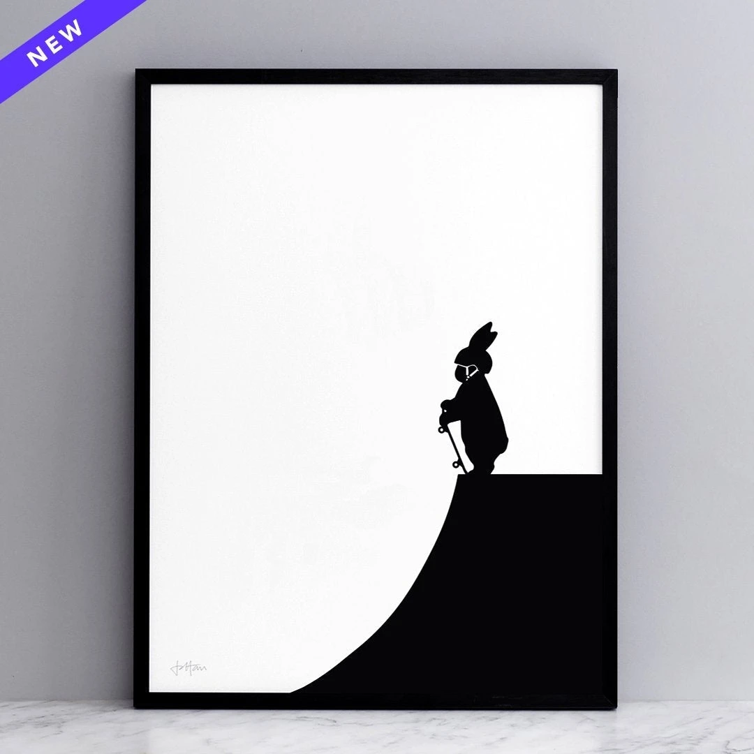 Scherenschnittartiges Kunstwerk auf dem ein Hase oben an der Halfpipe im Skaterpark steht.