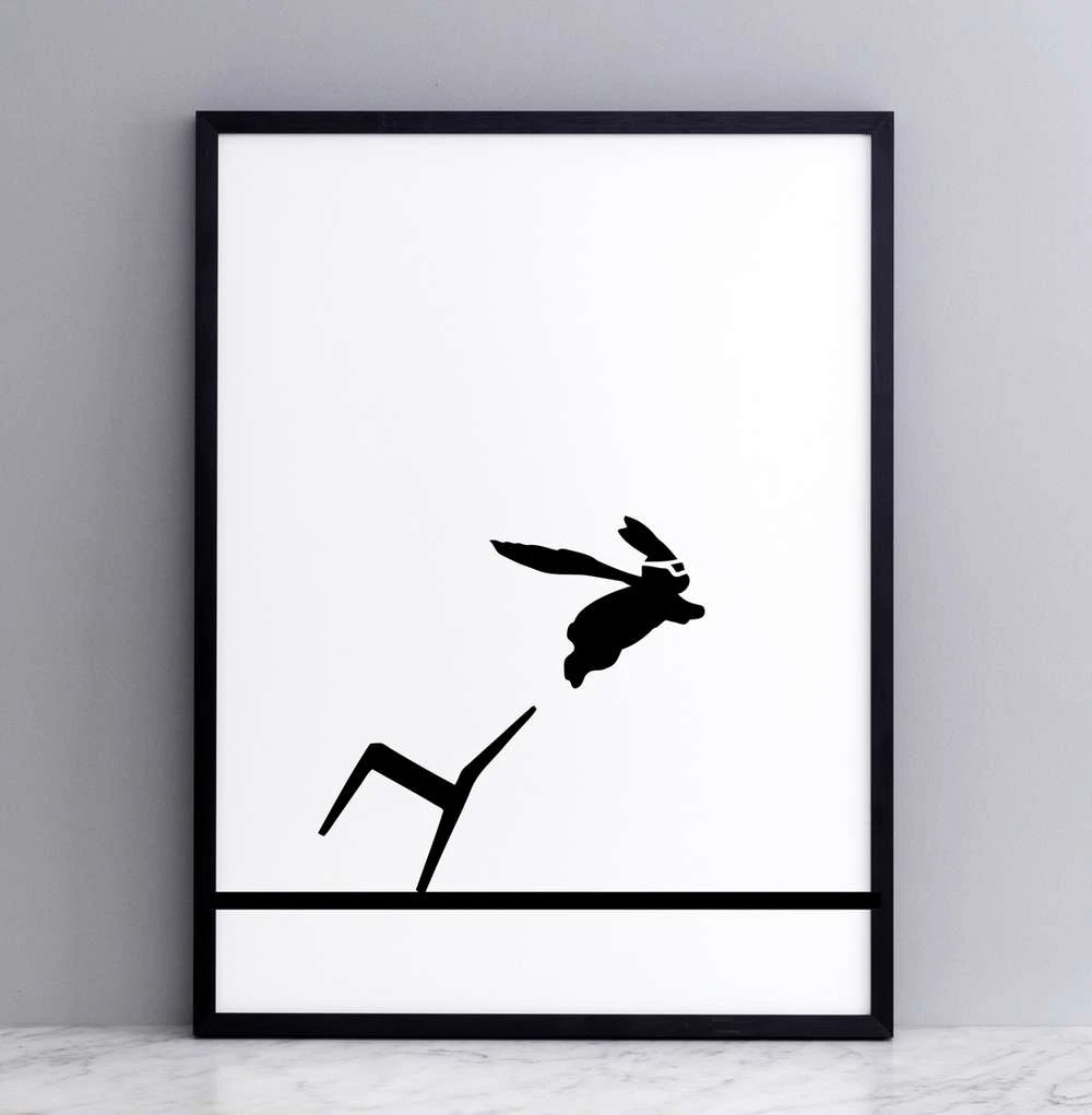 Das scherenschnittartige Kunstwerk mit fliegendem Super- Hasen der britischen Künstlerin Jo Ham als Siebdruck auf hochwertigem Papier gedruckt und signiert.
