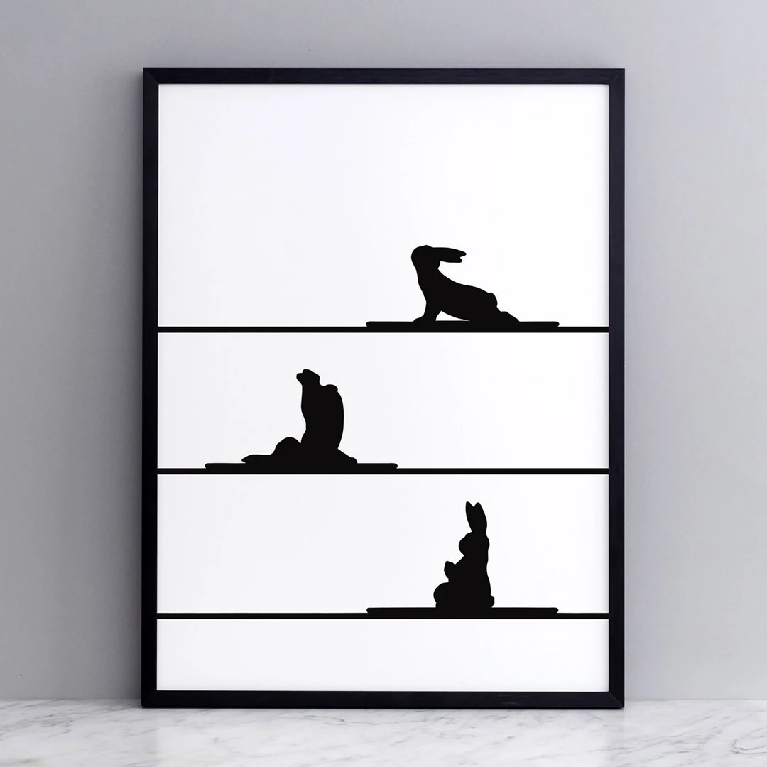 Scherenschnittartiges Kunstwerk auf dem das die Häschen Yoga machen. Von der britischen Künstlerin Jo Ham für Yogis.