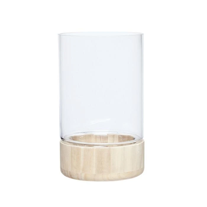 Klassiches Windlicht aus Glas, das auch als Vase genutzt werden kann. Der Sockel ist aus rohem Holz.