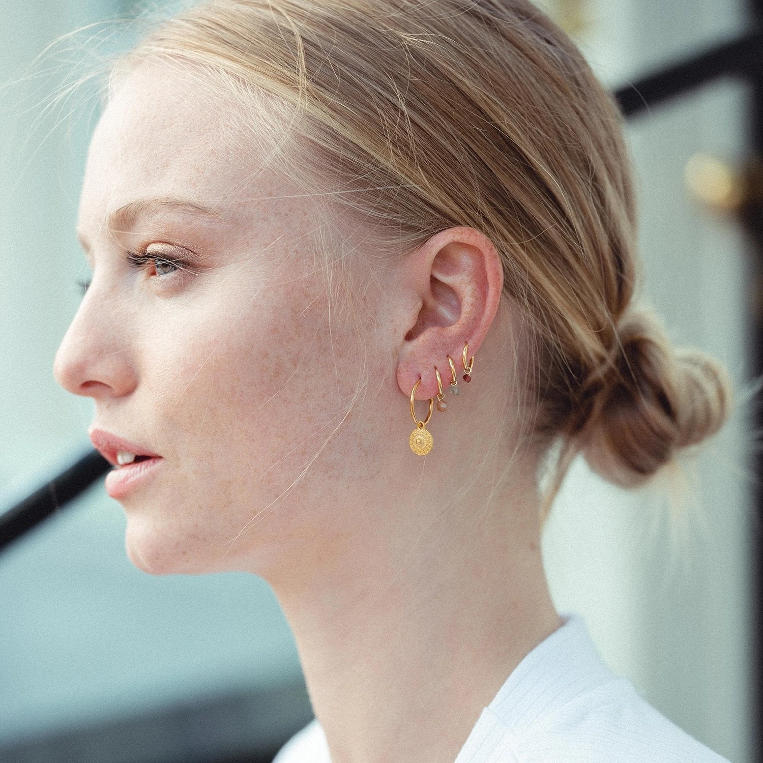 Kleine Creolen mit hochwertiger 18 Karat Vergoldung und kleinen geschliffenen Granaten.