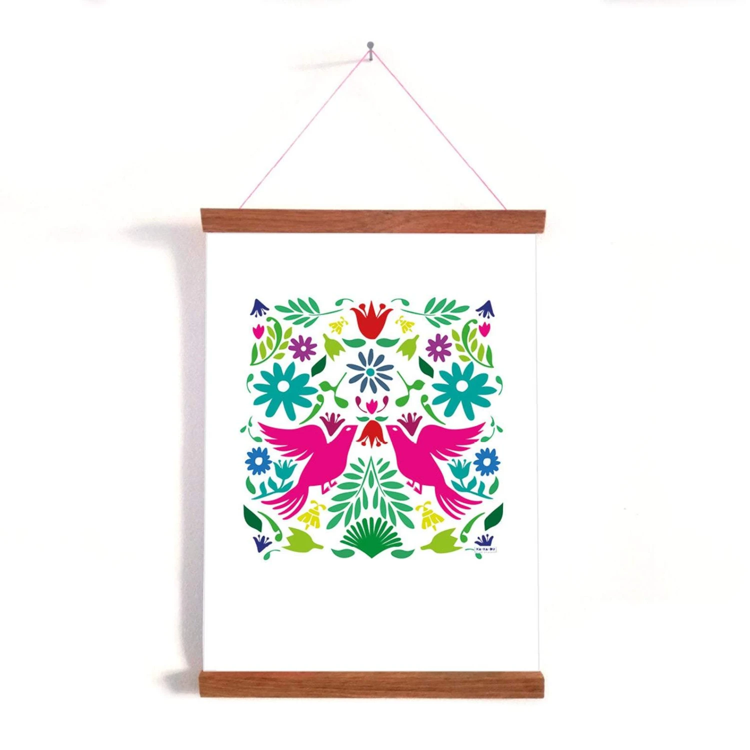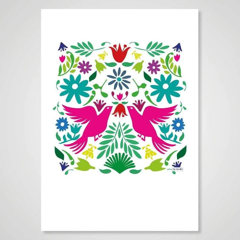 Fröhlich bunt und dennoch gar nicht aufdringlich, mit einem mexikanisch anmutenden Otomi, das unter anderem ein sich zugewandten Vogelpaar zeigt.