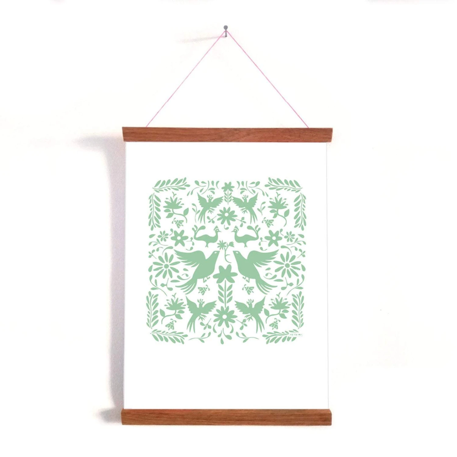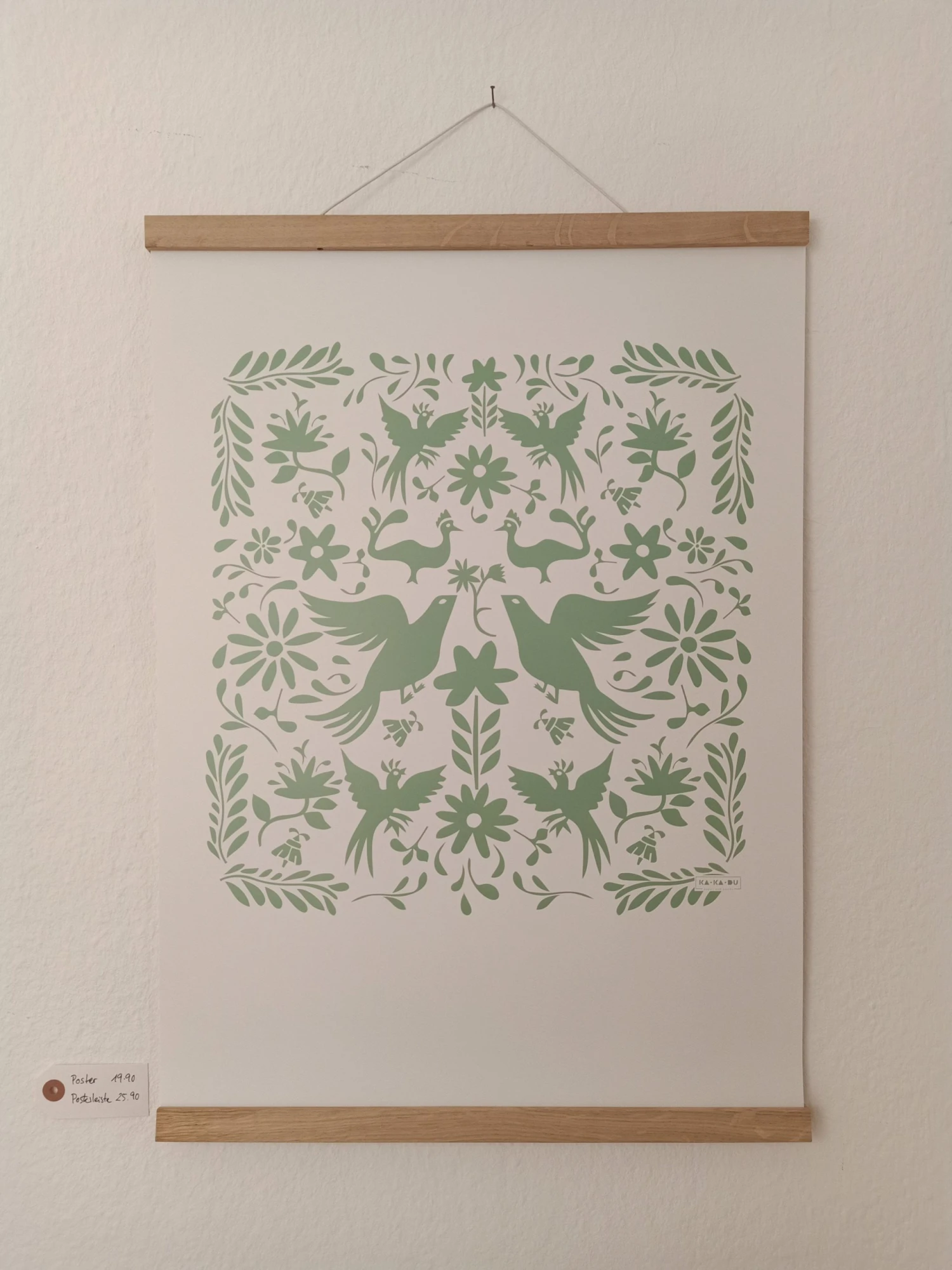 Ein zartes Lindgrün, gar nicht aufdringlich, mit einem mexikanisch anmutenden Otomi, das unter anderem ein sich zugewandten Vogelpaar zeigt.
