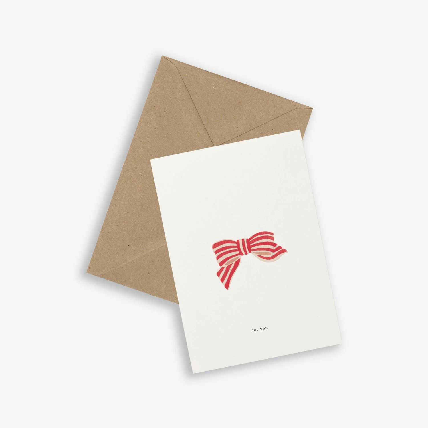Eine Geschenkschleife passt für viele Anlässe – ob groß oder klein – und ziert diese schöne Grußkarte. Sie zeigt eine rot weiß gestreifte Schleife und den Schriftzug „for you“. Eine simple, schöne Wasserfarben Illustration.