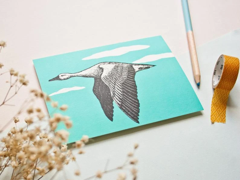 Die Künstlerin Katja Rub hat diese Graugans auf Schabekarton gestaltet und ihn dann in einer lokalen Druckerei vervielfältigen lassen.